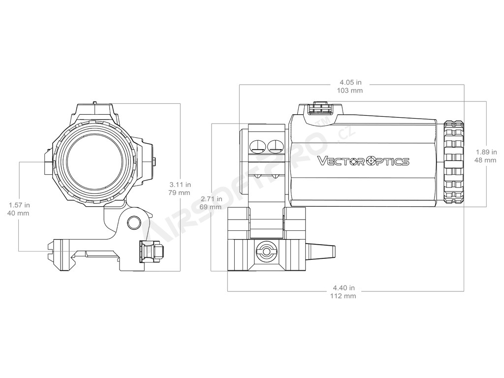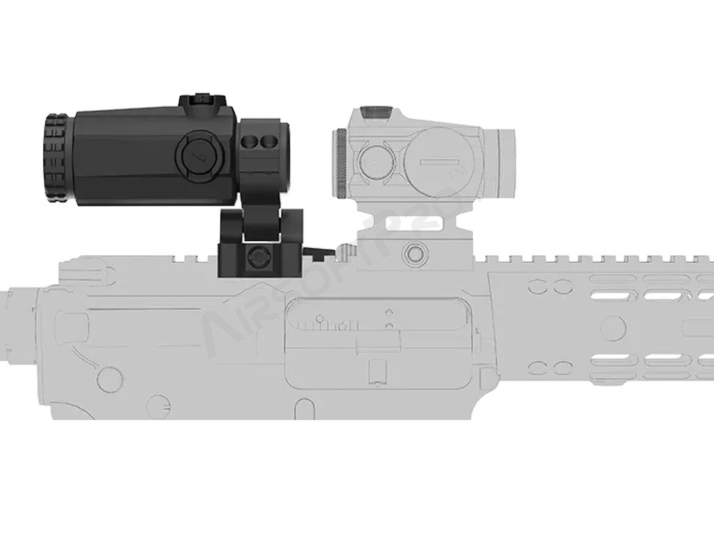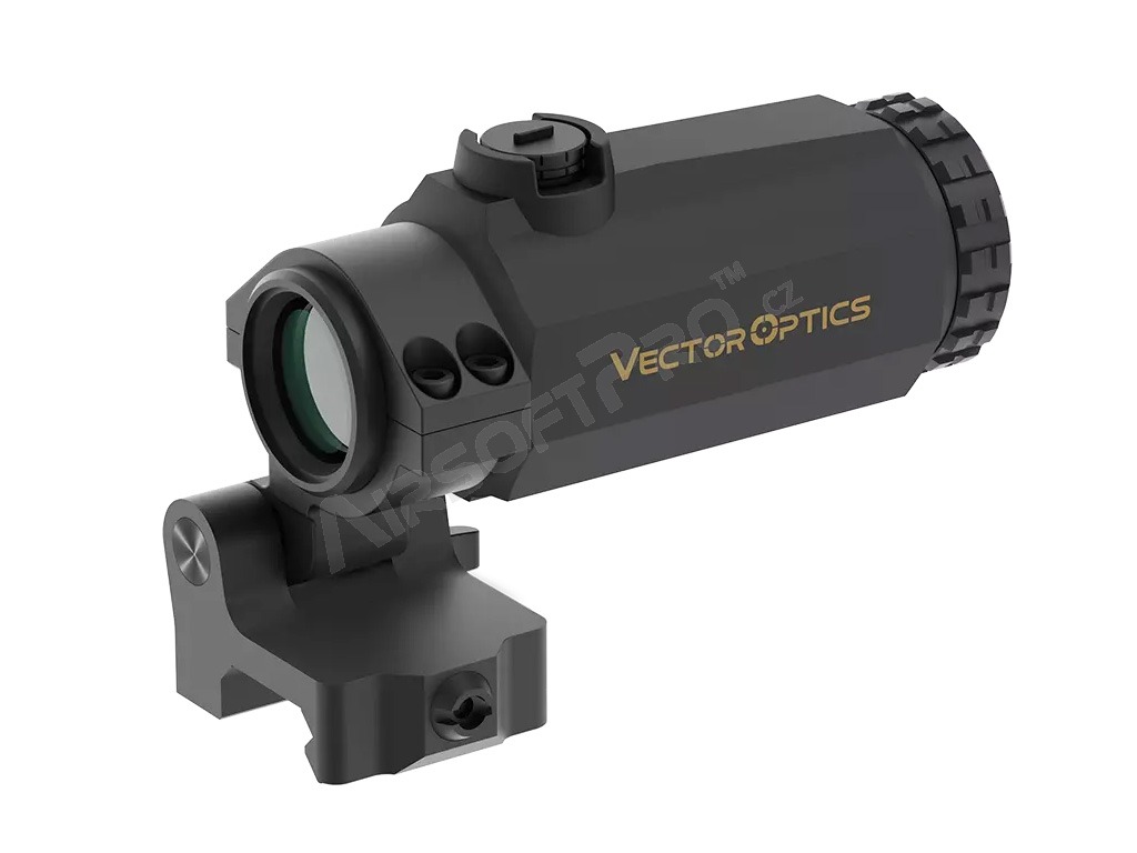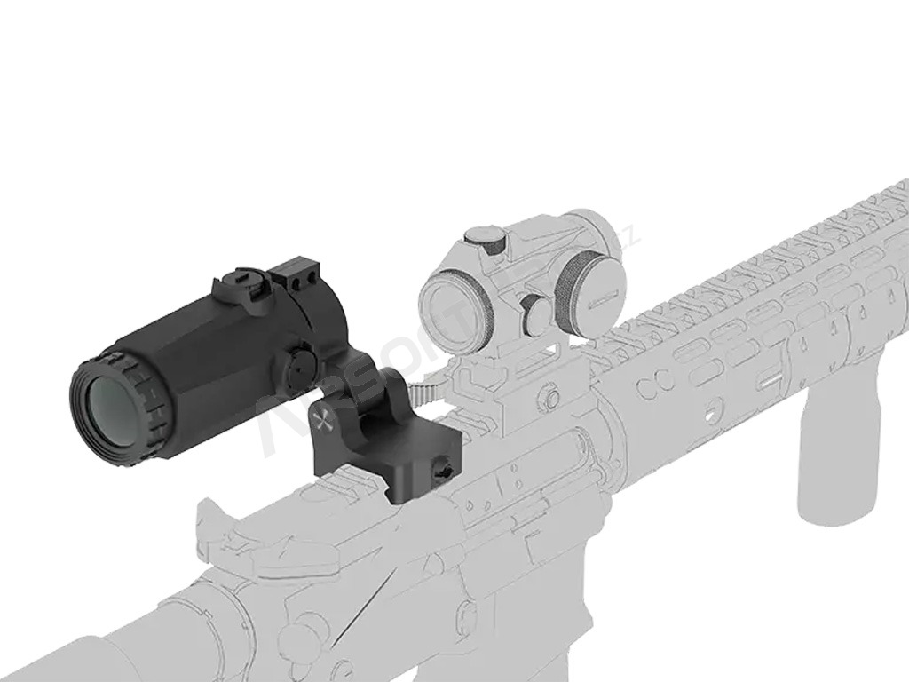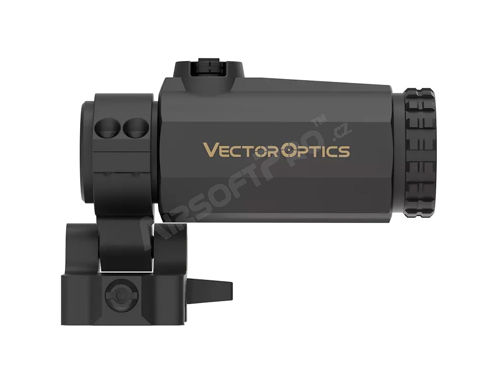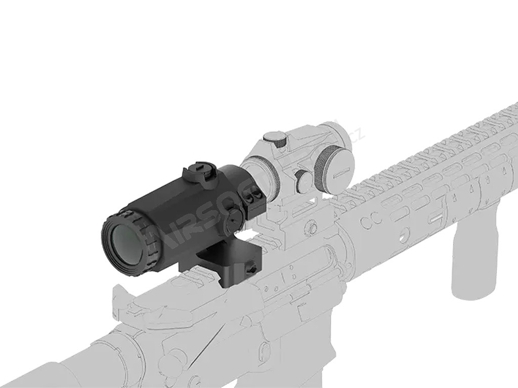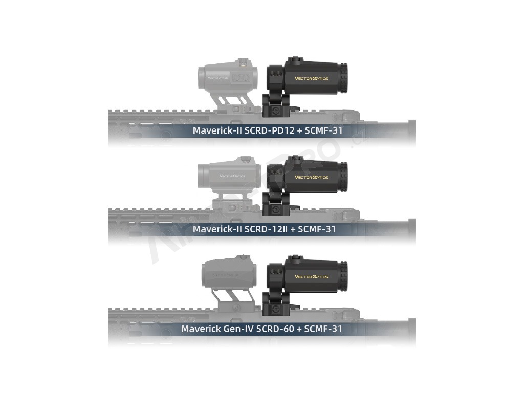 El Vector Optics Maverick Gen III MIL 3x22 es una óptica de 3 aumentos que se coloca delante del colimador (entre el colimador y el tirador). Se acerca al objetivo cuando se apunta a través del colimador a distancias más largas. Cuando se dispara a distancias más cortas, simplemente se puede inclinar hacia un lado y apuntar más lejos sólo a través del colimador.