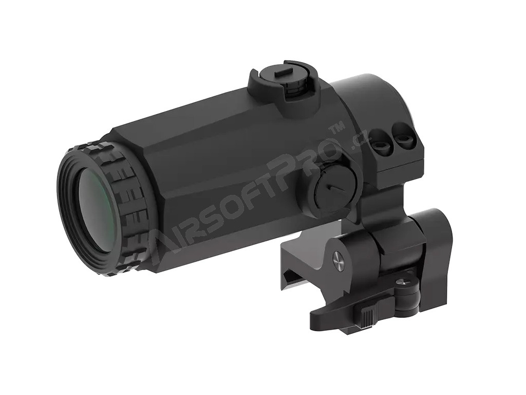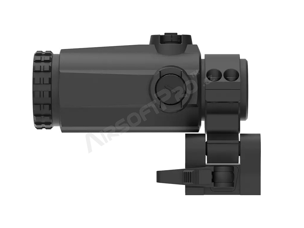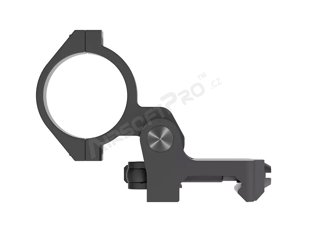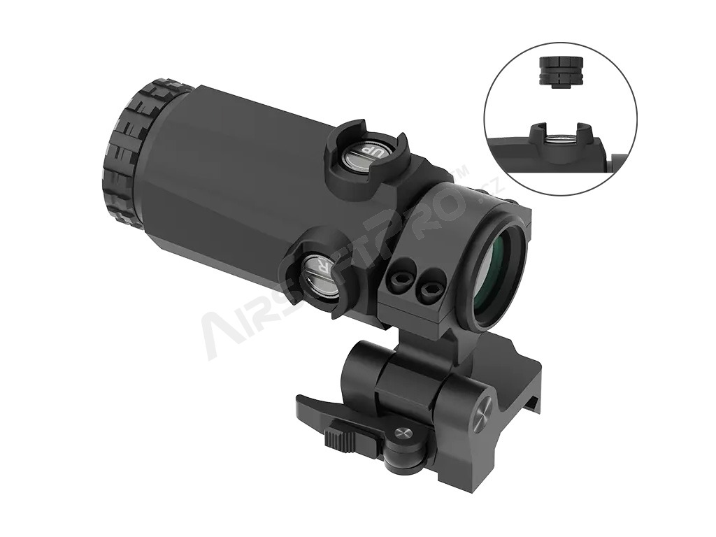 La óptica puede ajustarse horizontal y verticalmente de forma continua. La montura tiene una bisagra de bloqueo que permite inclinarla hacia un lado si es necesario. Se monta en un carril RIS estándar de 22 mm. La óptica está diseñada para armas de filo, pero por supuesto también se puede utilizar en armas de airsoft.