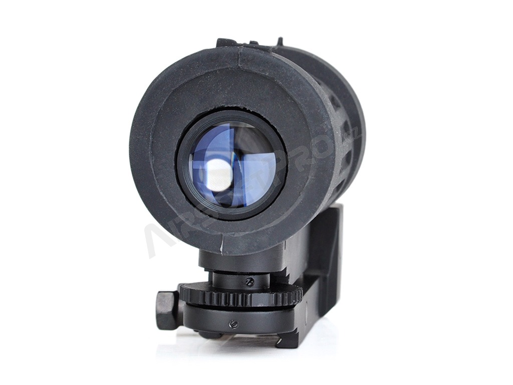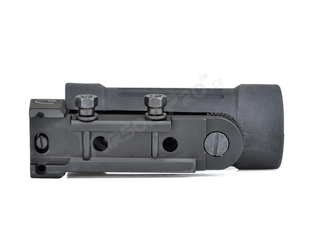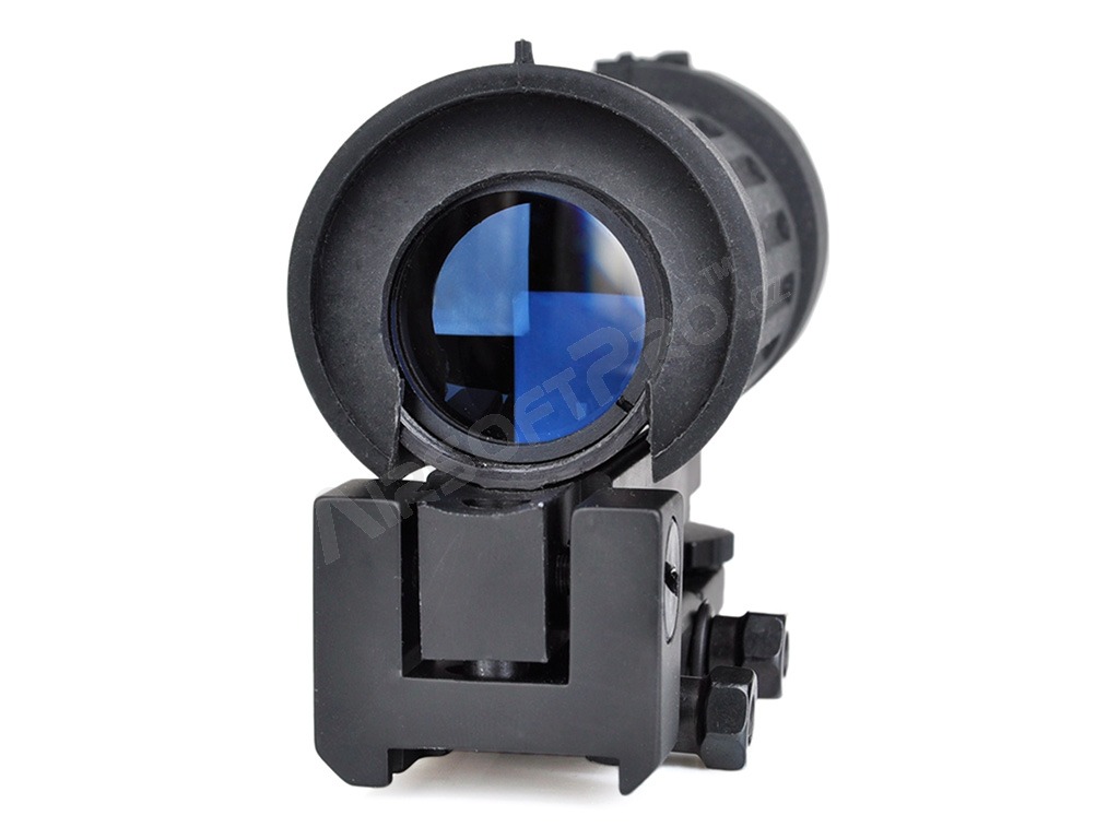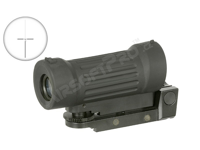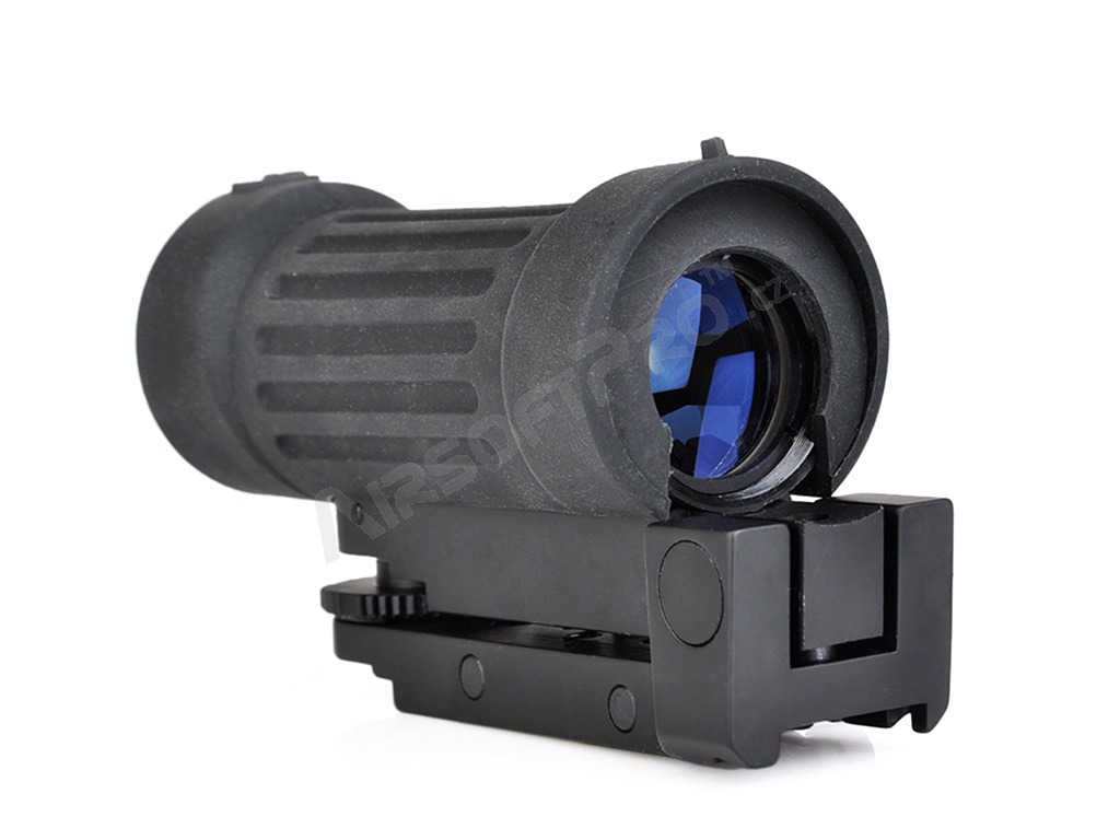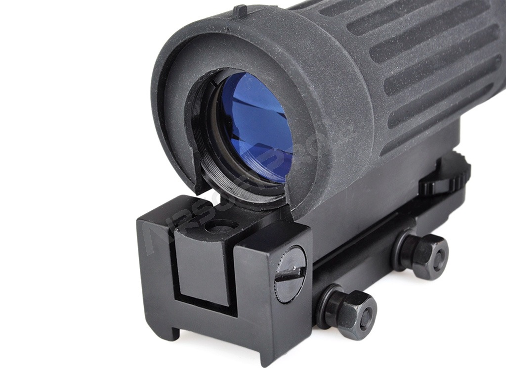 El visor tiene un aumento fijo de 4x. Las miras abiertas, incluidas las miras delantera y trasera, están situadas en la parte superior de la funda de goma. La cruz de mira se puede ajustar tanto vertical como horizontalmente. Se instala en el carril RIS.