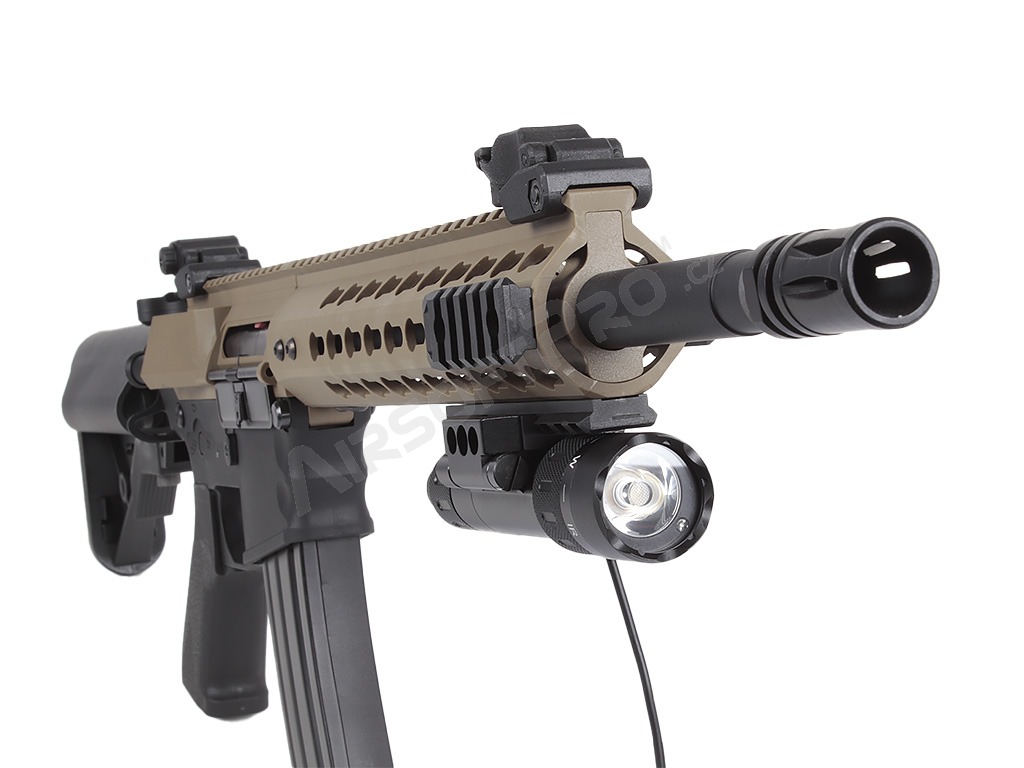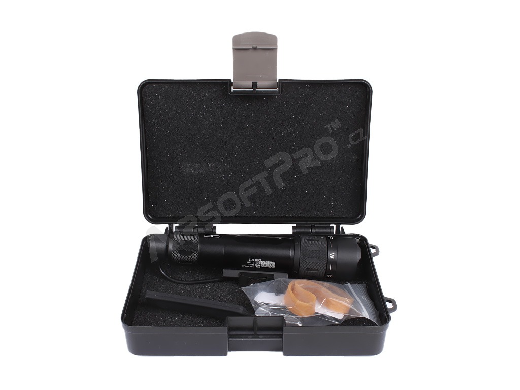 La lámpara está diseñada para montarse en un carril SIF de 22 mm. Se alimenta con dos pilas CR123A que proporcionan una larga duración y un rendimiento fiable. La linterna viene en un práctico estuche de plástico para facilitar su transporte y almacenamiento.