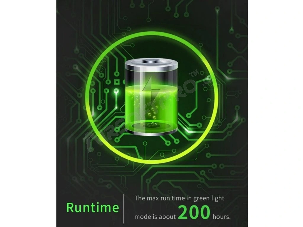 Se alimenta con 1 pila CR123A (no incluida). La autonomía es de hasta 200 h en modo de luz verde fija, 56 h en modo de luz blanca intermitente y 10 h en modo IR.