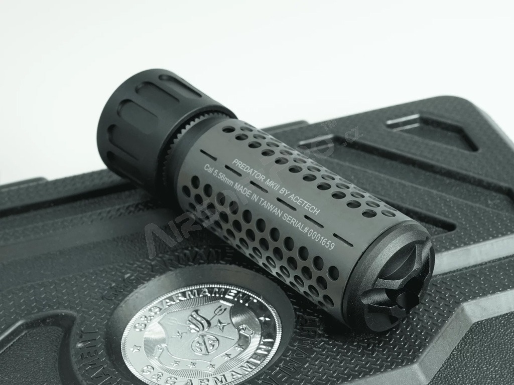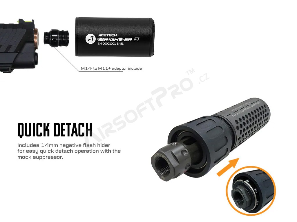 La ventaja es el sistema de liberación rápida. En el paquete se incluye un compensador especialmente modificado que se atornilla al arma y el silenciador se acopla a él solo con el sistema de liberación rápida, sin necesidad de atornillarlo al arma cada vez.