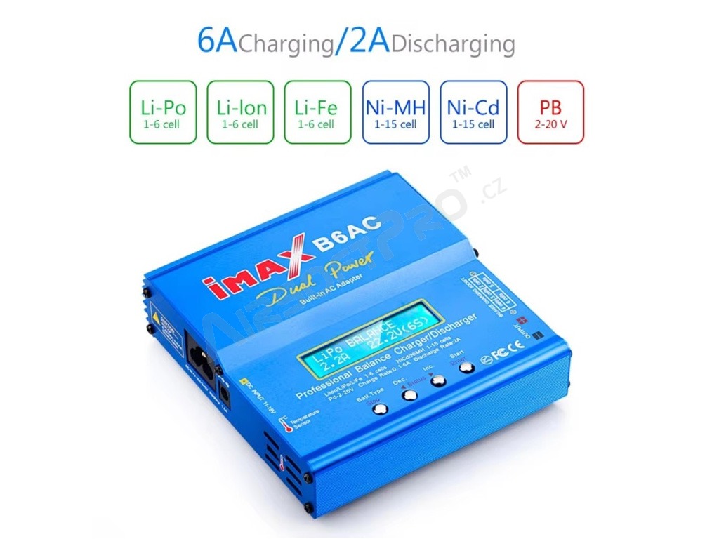 El software de funcionamiento optimizado del cargador iMax B6AC tiene una función AUTO que controla la velocidad de carga durante la carga y la descarga. Puede cargar hasta 6 A (la potencia de carga total es de hasta 80 W) y descargar hasta 2 A. En el caso de las baterías de litio, esto puede evitar, por ejemplo, el sobrecalentamiento que puede provocar una explosión debido a un mal ajuste por parte del usuario. El cargador desconecta automáticamente el circuito y activa una alarma en caso de avería. Todos los modos de funcionamiento de este cargador se controlan automáticamente para ofrecer la máxima seguridad. Todos los ajustes pueden ser configurados por el usuario.
