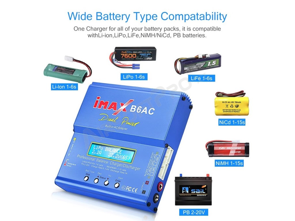 - Compatible con baterías de Ni-Cd, Ni-MH, Li-Po, Li-Lo, Li-Fe, Pb