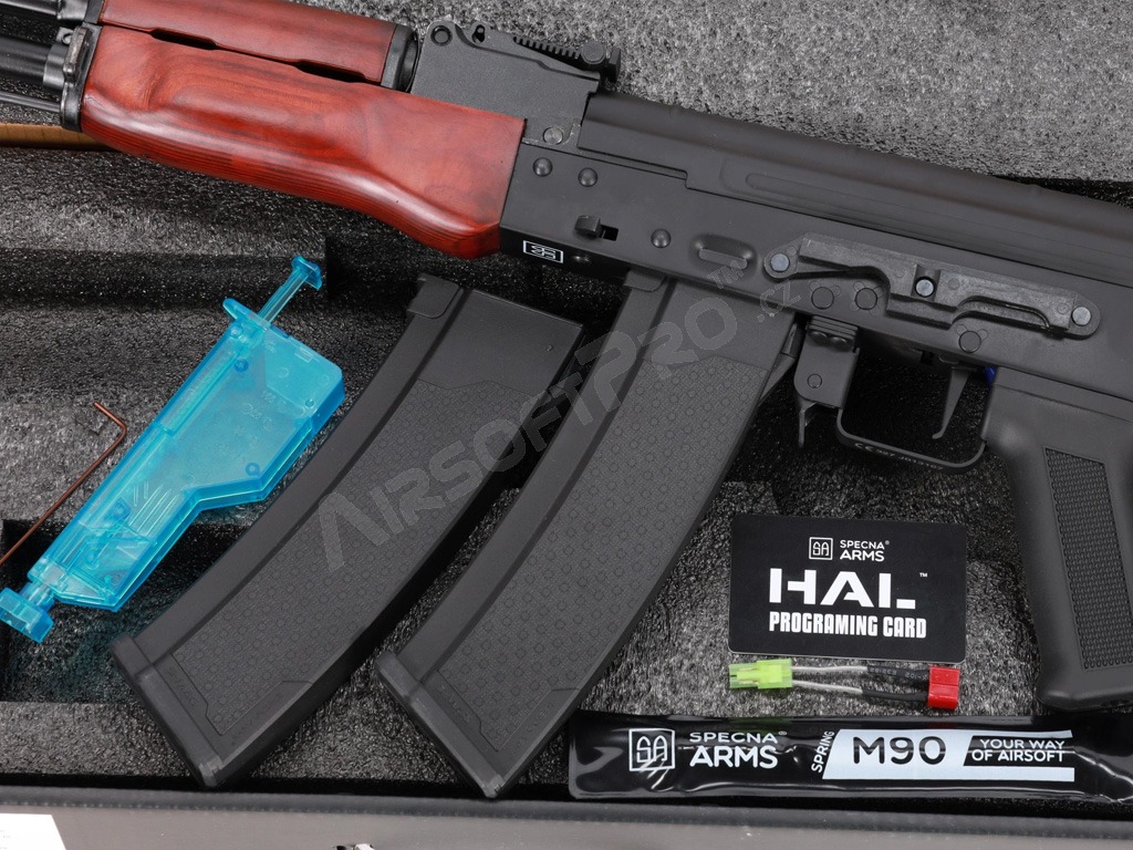 El arma está equipada con una unidad procesadora Specna Arms HAL, que utiliza un gatillo magnético basado en el efecto Hall. El sistema garantiza una respuesta rápida del gatillo, una sensibilidad ajustable y un funcionamiento fiable incluso en condiciones adversas. La programación se realiza a través del gatillo y del interruptor de modo de disparo, sin necesidad de un dispositivo externo.