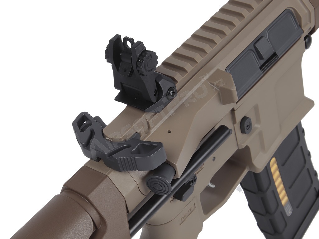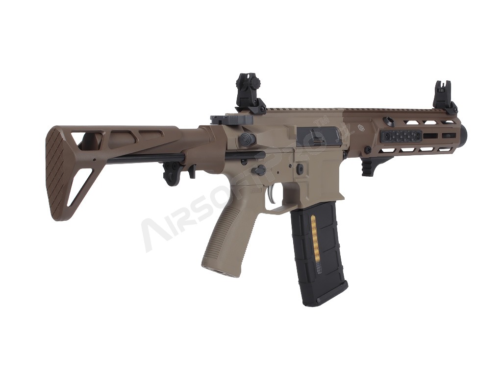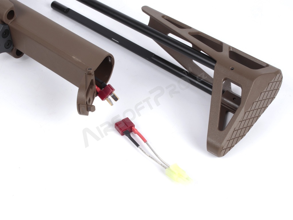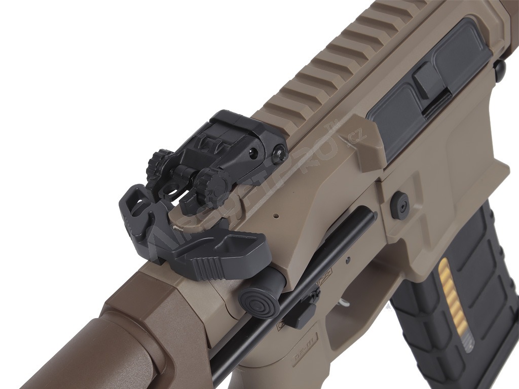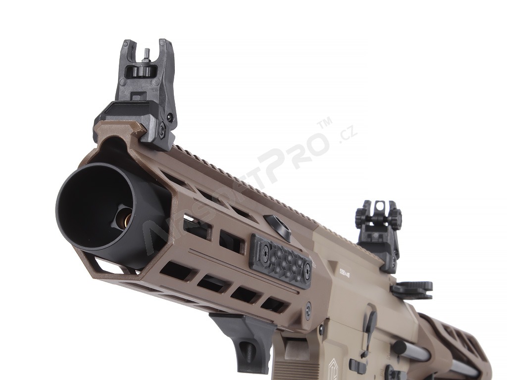 El cuerpo de polímero ligero con piezas metálicas mantiene el peso total agradablemente bajo - sólo 2,26 kg - sin dejar de ser lo suficientemente duradero para los despliegues de airsoft de combate. La ligera culata retráctil ajusta la longitud de 622 a 735 mm (4 posiciones), las miras plegables permiten utilizar fácilmente un colimador y el antebrazo M-LOK ofrece espacio para un montaje modular. El interruptor de disparo ambidiestro, la moderna palanca de armado del cerrojo y el tope de cerrojo funcional garantizan un manejo cómodo. El eficaz amplificador de sonido de aluminio añade un potente efecto acústico al disparar.