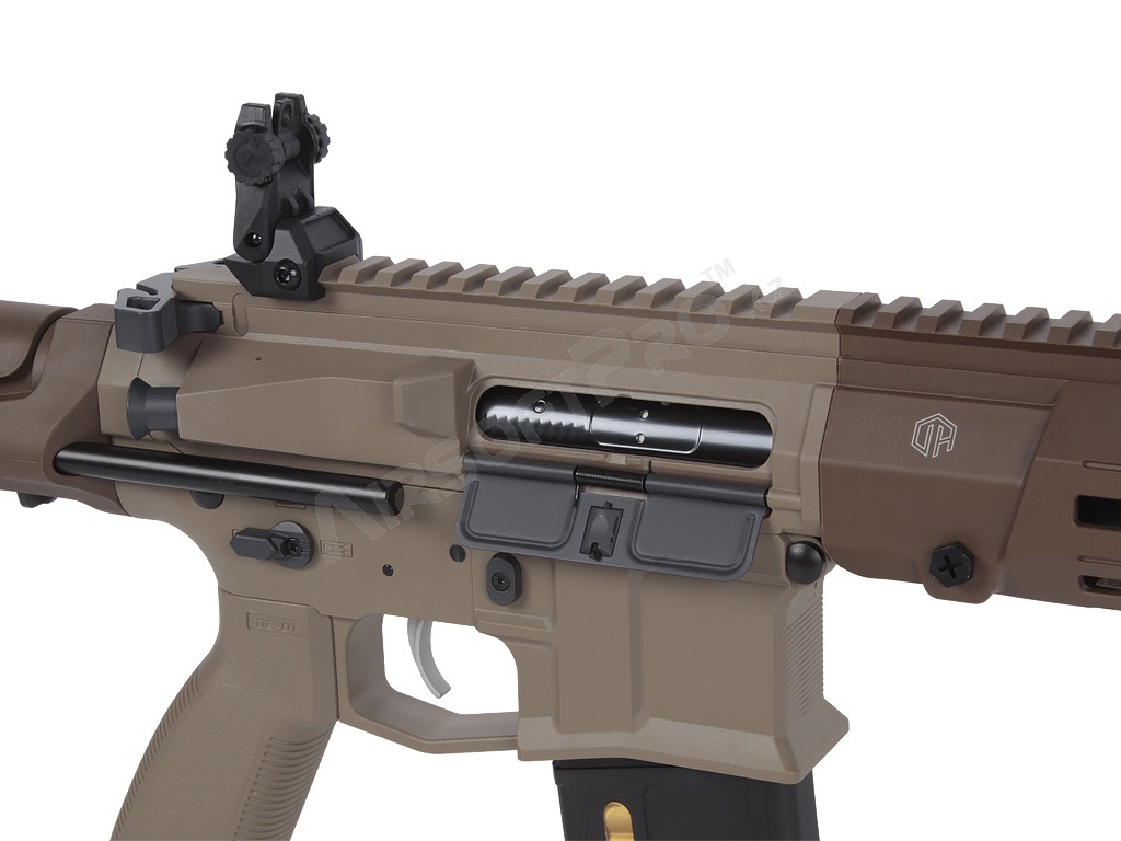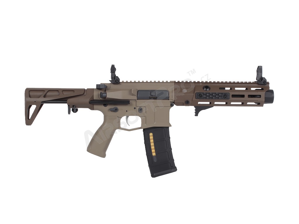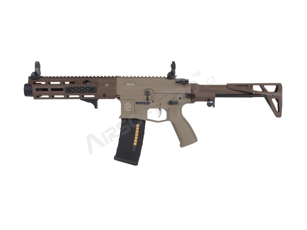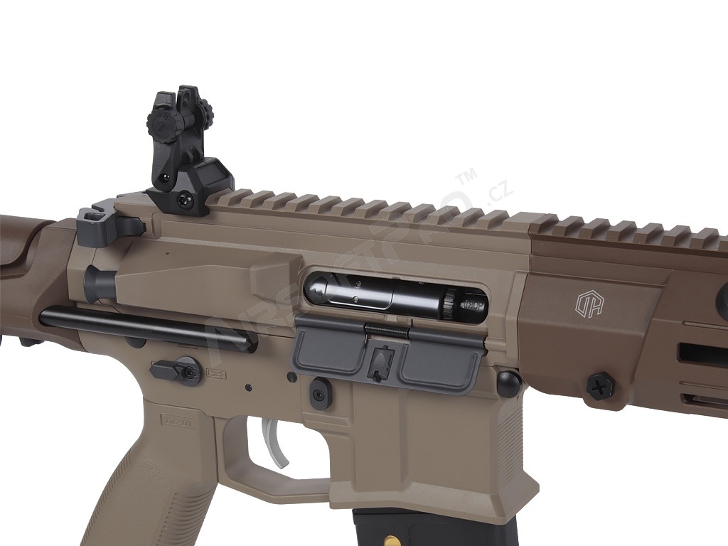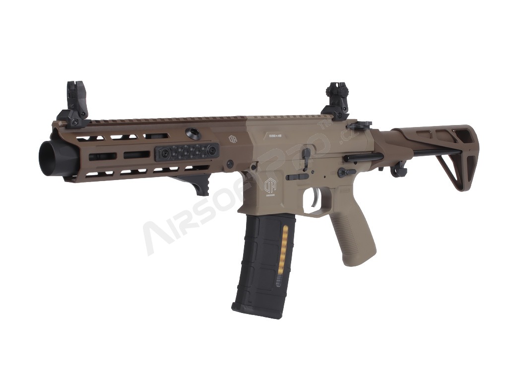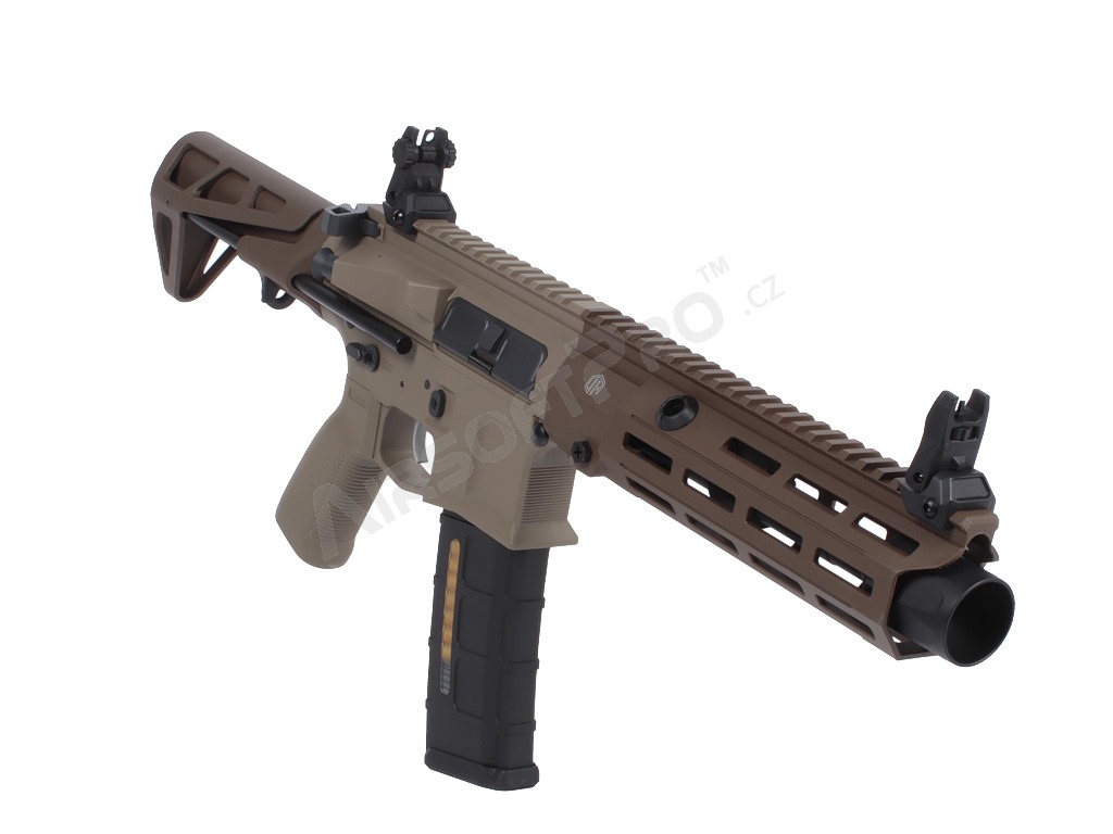 El cuerpo de polímero ligero con piezas metálicas mantiene el peso total agradablemente bajo - sólo 2,26 kg - sin dejar de ser lo suficientemente duradero para los despliegues de airsoft de combate. La ligera culata retráctil ajusta la longitud de 622 a 735 mm (4 posiciones), las miras plegables permiten utilizar fácilmente un colimador y el antebrazo M-LOK ofrece espacio para un montaje modular. El interruptor de disparo ambidiestro, la moderna palanca de armado del cerrojo y el tope de cerrojo funcional garantizan un manejo cómodo. El eficaz amplificador de sonido de aluminio añade un potente efecto acústico al disparar.