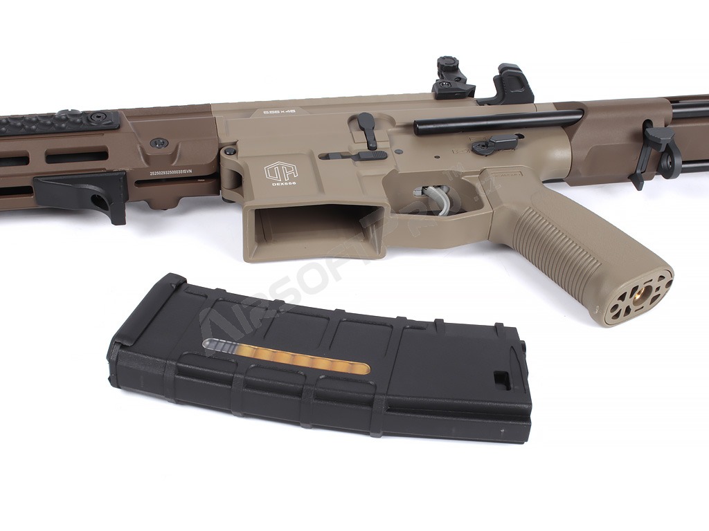 El arma es compatible con una batería de 11,1 V nada más sacarla de la caja; se incluye un adaptador de conector Dean-T a Tamiya pequeño para facilitar la conexión de baterías normales. También se incluye un cargador tipo PMAG con cartucheras de imitación (empujador) con capacidad para 180 cartuchos.