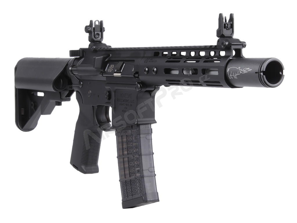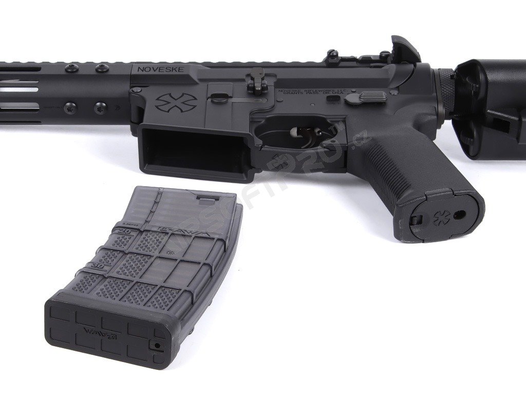 - Construcción totalmente metálica extremadamente duradera con marcas Noveske grabadas en la carcasa superior e inferior, el guardamonte, el cañón exterior, la palanca de armado y los pasadores.