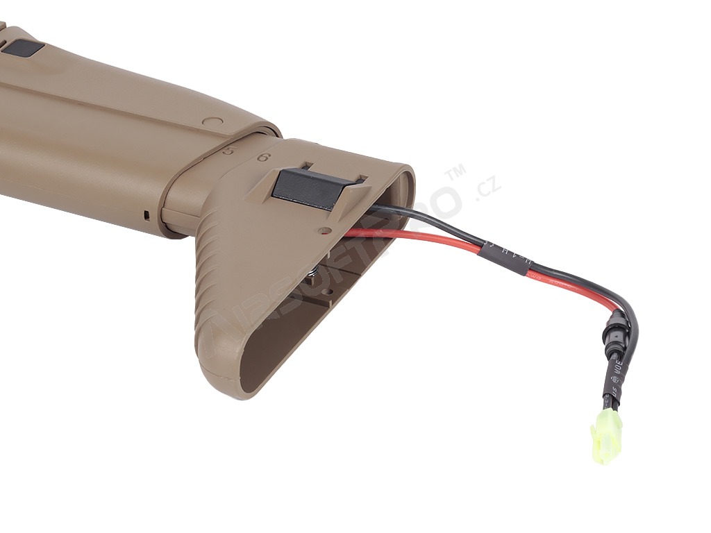 La batería se conecta mediante un conector clásico Mini Tamiya y se guarda directamente en la culata. La gran ventaja es la compatibilidad total con cargadores M4 extendidos.