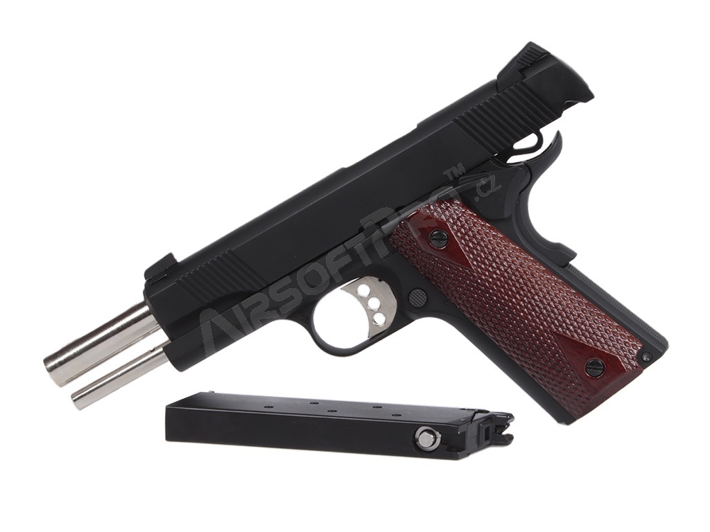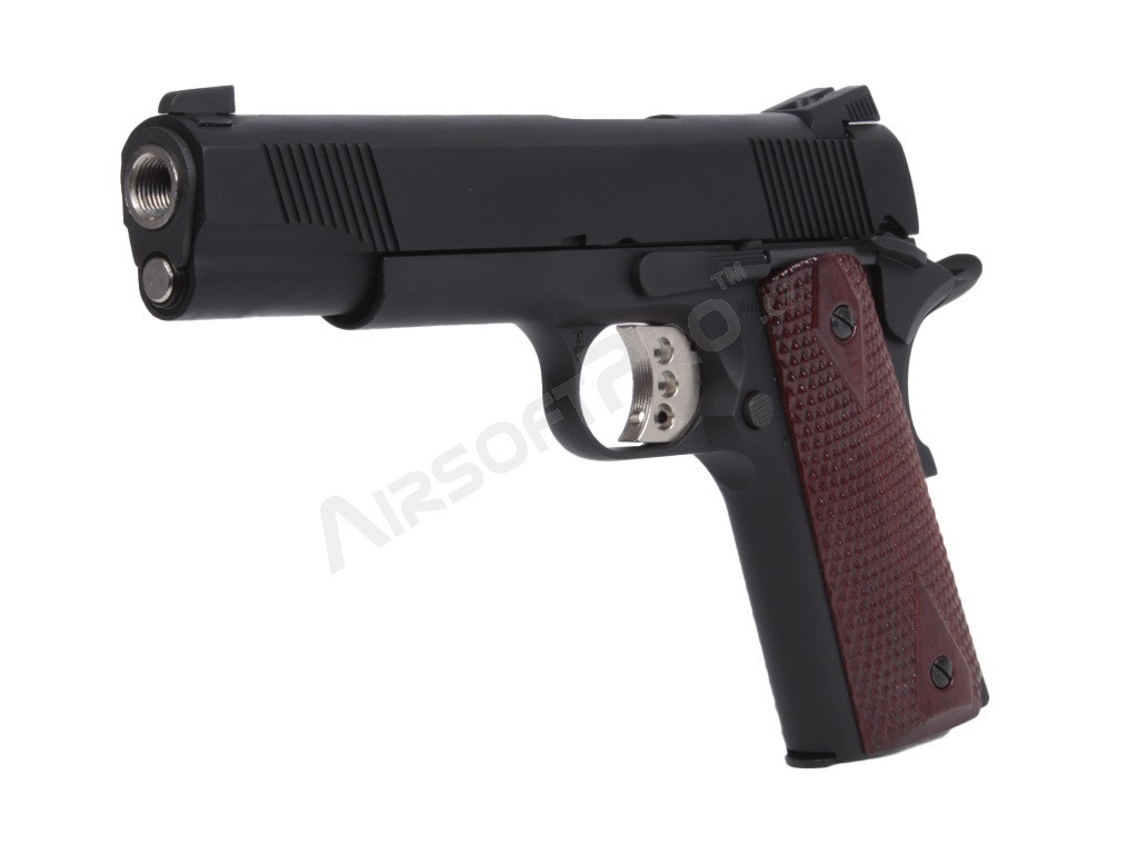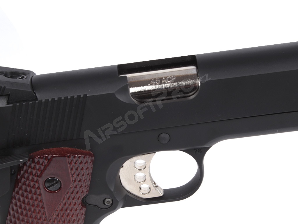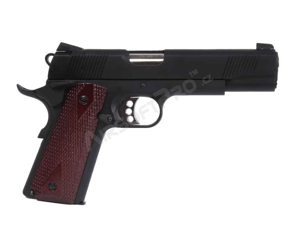 La pistola es totalmente metálica, con culata y armazón inferior metálicos, lo que se traduce en una gran durabilidad y un peso realista. Las ranuras delantera y trasera de la culata facilitan el amartillado con confianza. Los cañones de polímero con imitación de madera conservan el aspecto y el tacto tradicionales de la 1911 y un agarre cómodo. Esta variante también impresiona con un gatillo ligero (esqueletizado) con orificios que acentúa el aspecto más deportivo.
