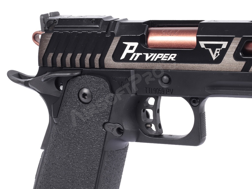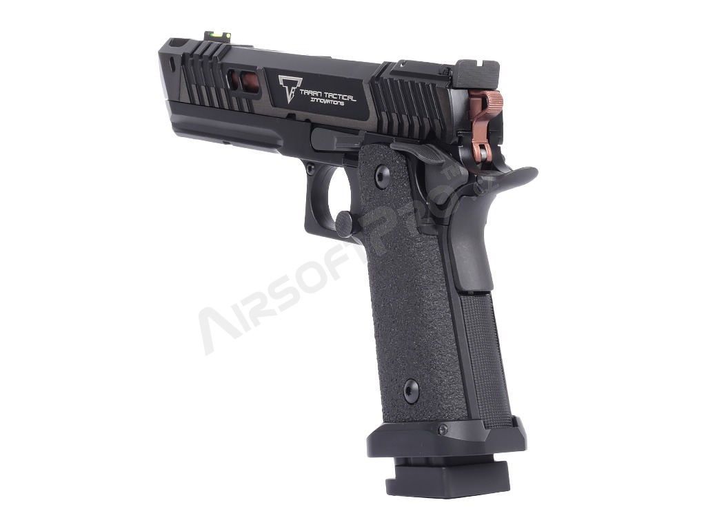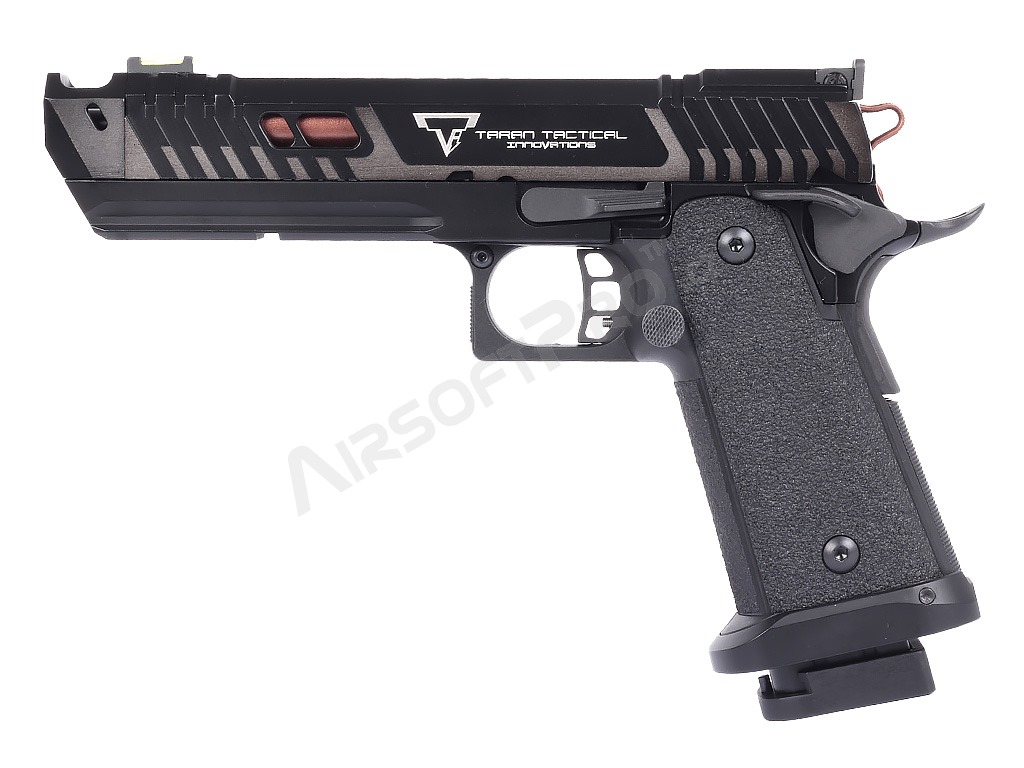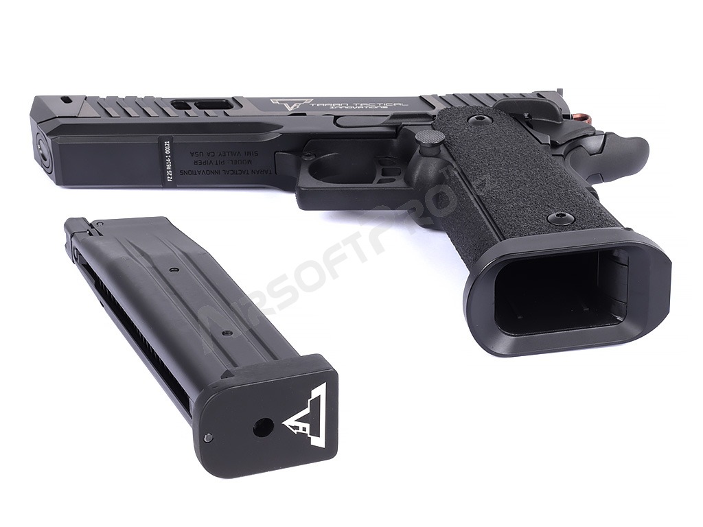 La pistola está construida sobre un robusto armazón con culata de aluminio que le confiere la durabilidad necesaria y un peso realista de 1050 g. La corredera y el armazón presentan marcas láser auténticas y un grabado profundo del logotipo de Taran Tactical Innovations y las marcas de Pit Viper.