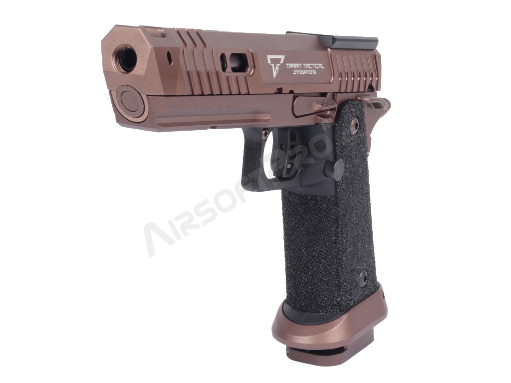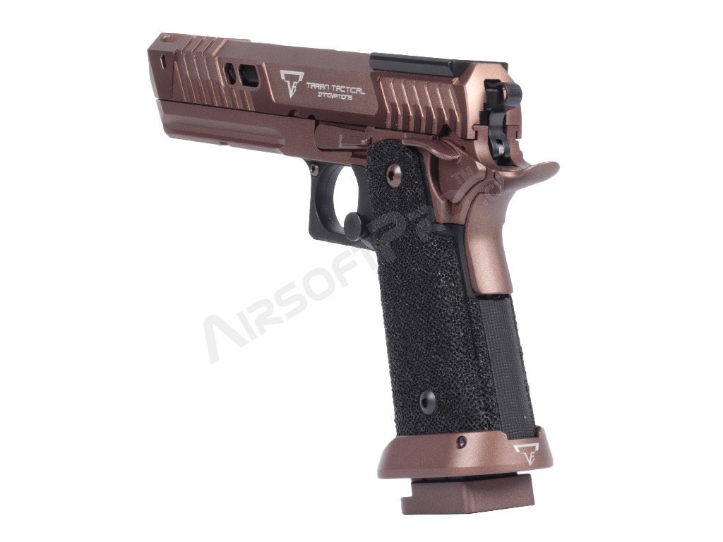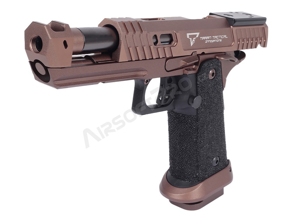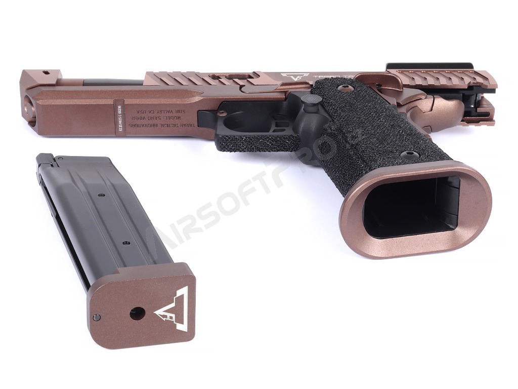 La pistola está dominada por una culata fresada con precisión fabricada en aluminio 7075 de alta resistencia mediante tecnología CNC. El acabado de alto brillo (acabado de oxidación) confiere al arma un aspecto lujoso y aumenta la resistencia al desgaste. La corredera y el armazón presentan marcas láser auténticas y un grabado profundo del logotipo de Taran Tactical Innovations y las marcas de Sand Viper.