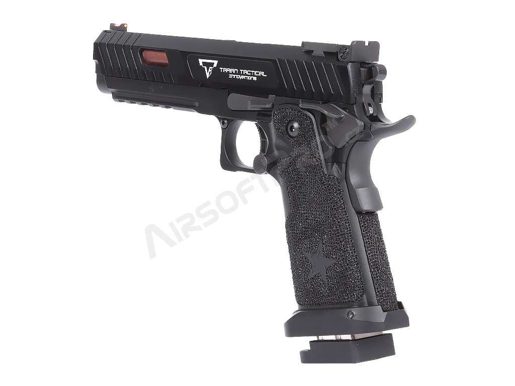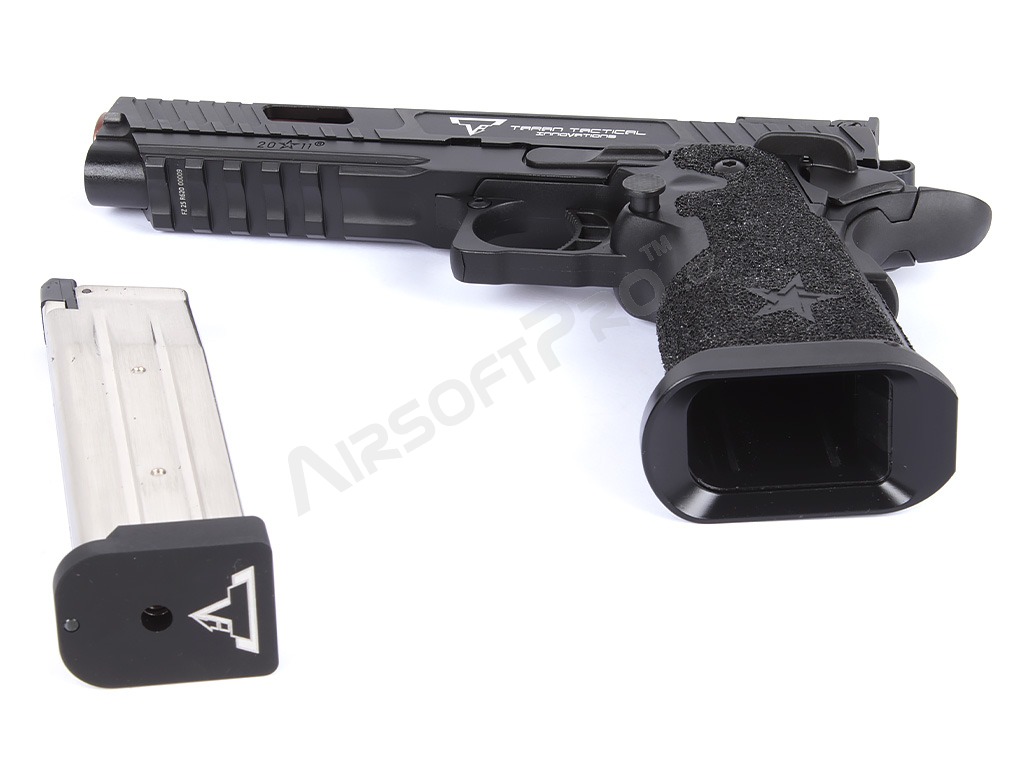La pistola está construida sobre un robusto armazón con culata de aluminio que le confiere la durabilidad necesaria y un peso realista de 1050 g. La corredera y el armazón presentan marcas láser auténticas y un grabado profundo del logotipo de Taran Tactical Innovations y las marcas STACCATO.