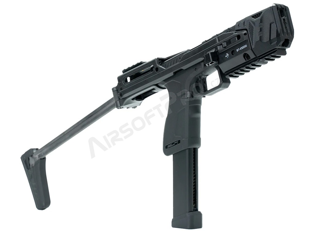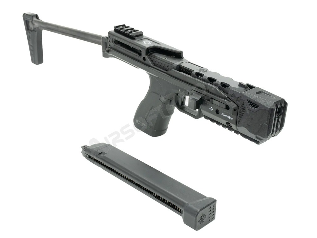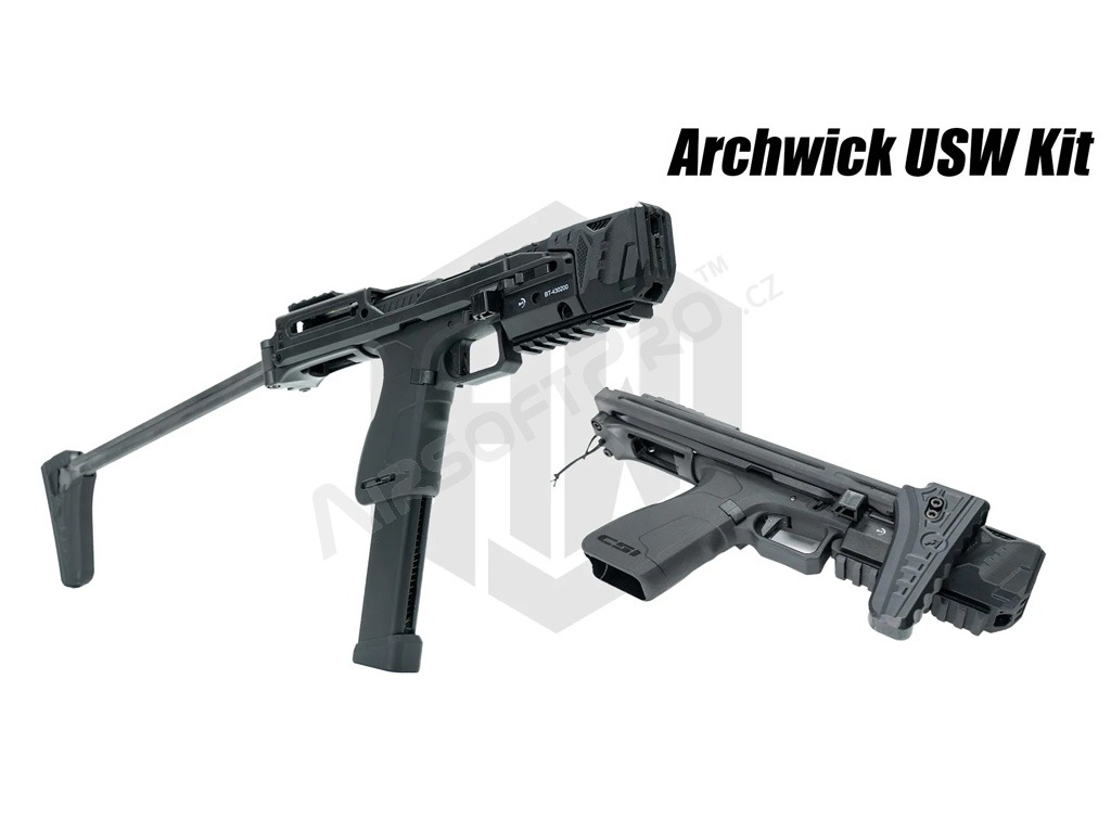 El kit de conversión B&T USW está fabricado en polímero reforzado con fibra de vidrio y lleva el estampado y los logotipos oficiales de B&T. La culata plegable permite cambiar rápidamente de una pistola compacta a una plataforma estable para disparos de precisión a mayor distancia.