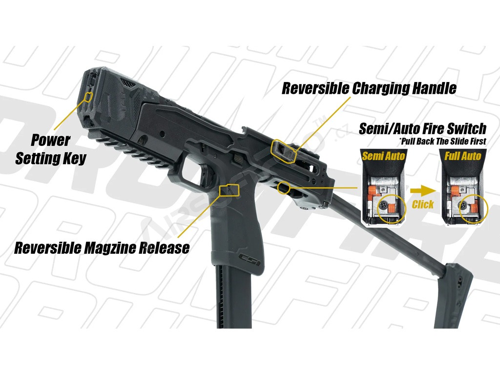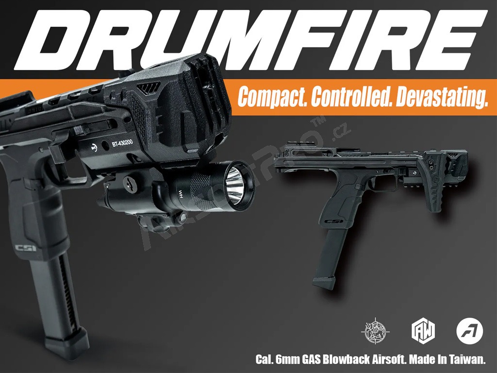 La pistola cuenta con una culata de precisión Poseidon Orion y un cuerpo ligero pero extremadamente duradero fabricado completamente en nylon resistente. La montura RMR en la parte superior de la corredera (sin culata plegable) o el carril RIS en la culata plegable permiten la fácil instalación de un colimador. Gracias al sistema de interruptor de disparo incorporado, puede cambiar fácilmente entre los modos Semi (disparo único) y Full Auto (ráfaga), lo que convierte al Drumfire en un adversario peligroso en escenarios CQB.