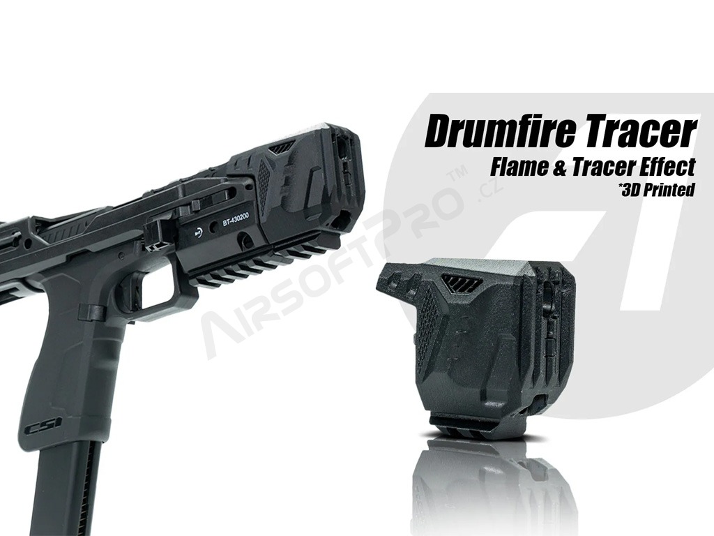 El Acetech Drumfire GBB es un conjunto táctico completo que empuja el límite entre pistola y subfusil. En el corazón de este sistema se encuentra una pistola Poseidon Orion de alta calidad montada en un kit B&T USW con licencia, completa con una unidad de iluminación de efecto llama única (unidad Drumfire).