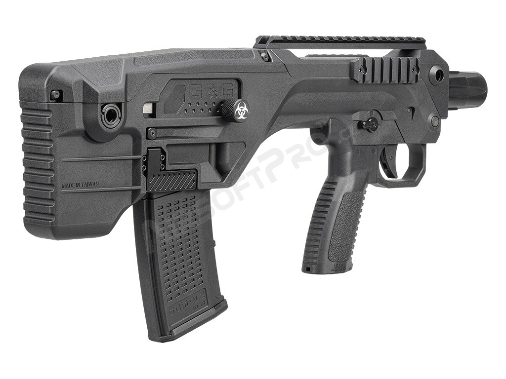 La escopeta está diseñada para una rápida y eficaz "limpieza" de las habitaciones durante los juegos CQB. Las ventajas de esta escopeta incluyen, además de la gran mano de obra material que es estándar con G&G, la compatibilidad con los cargadores M4 AEG, una enorme cámara de gas en la culata de la escopeta y un fácil manejo. La escopeta dispara 5 o 10 perdigones por disparo con una dispersión que apreciarás en el combate cuerpo a cuerpo.