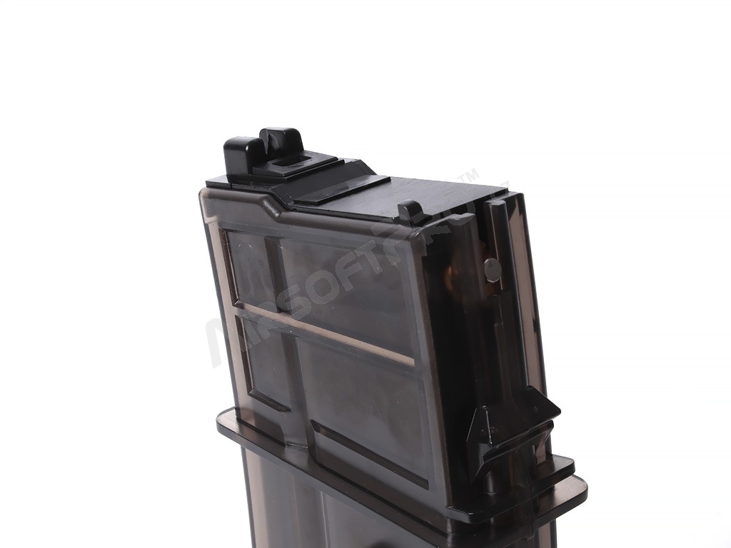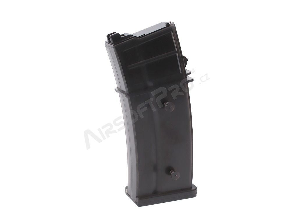 Principio de funcionamiento: El arma funciona según el principio del gas propulsor comprimido (Green Gas). Este gas se bombea desde el cilindro manual (disponible en la e-shop) al cuerpo del cargador en cuestión de segundos. Una recarga de gas suele ser suficiente para al menos un cargador lleno de balines.