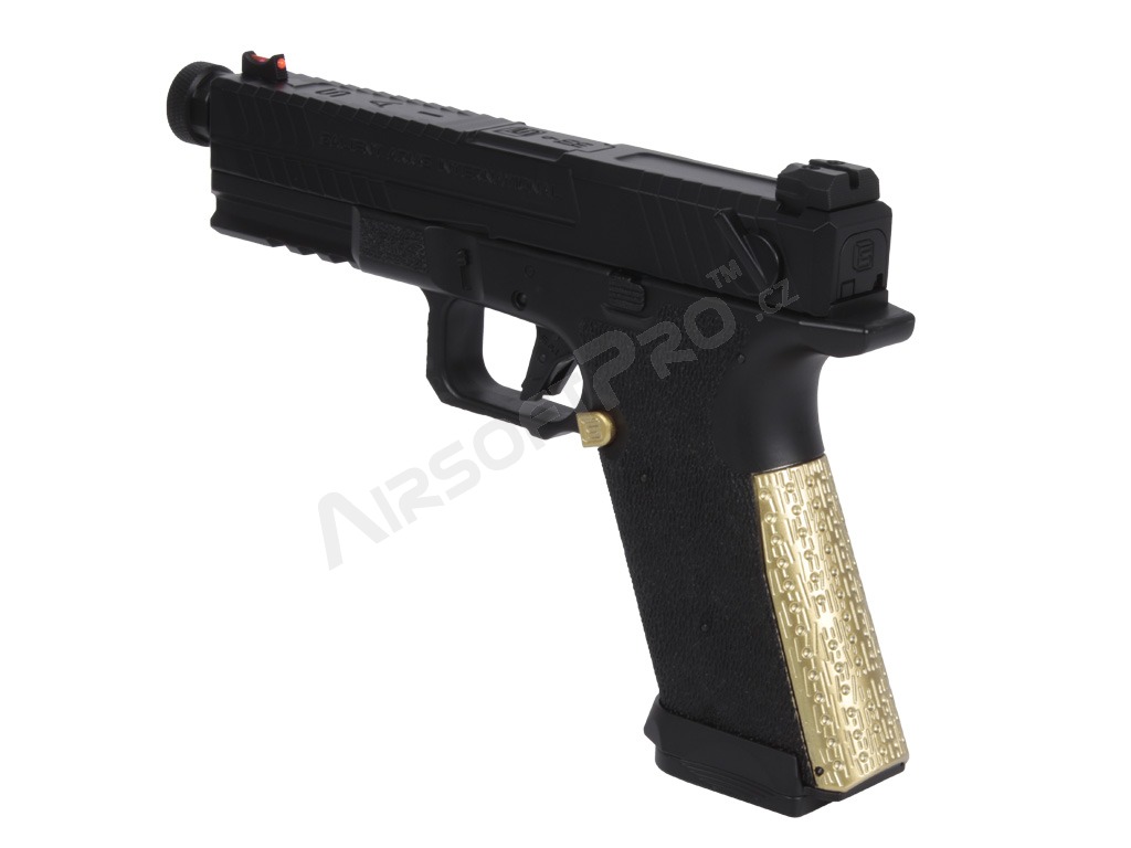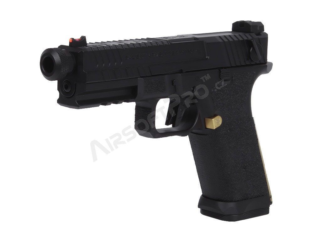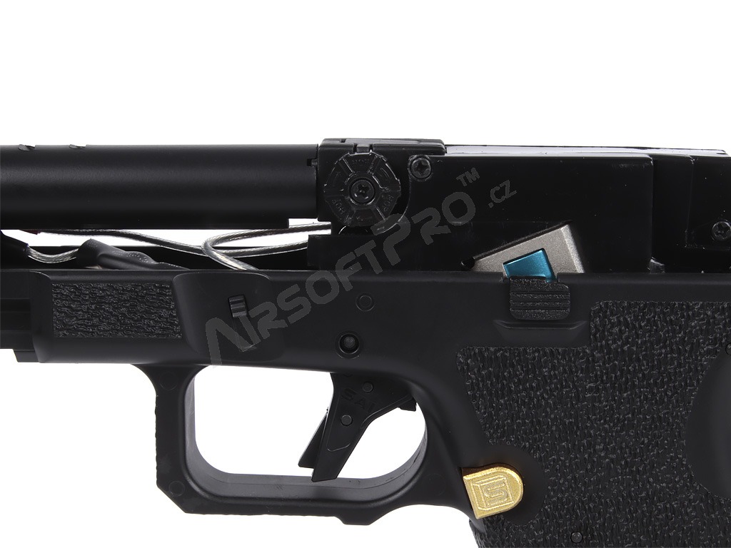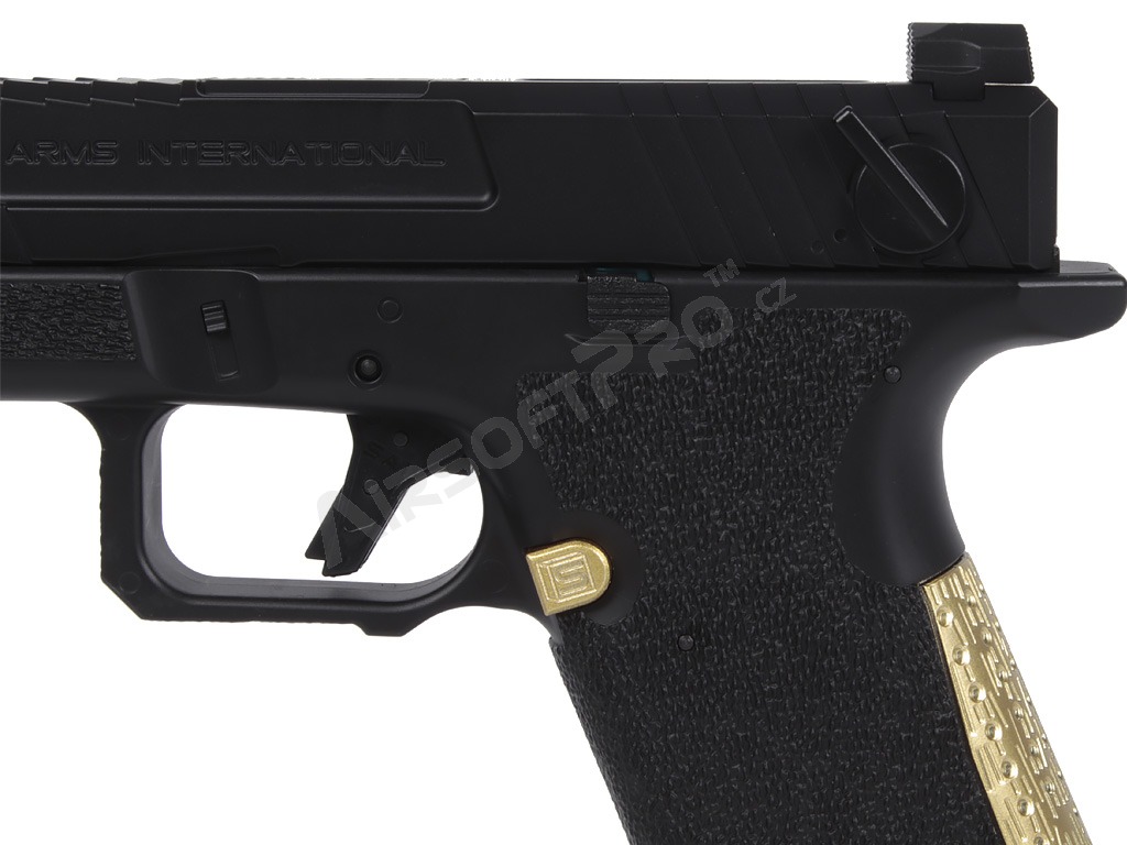 El cuerpo combina partes metálicas y de polímero - armazón de polímero con ergonomía mejorada y textura de agarre agresiva para un agarre seguro. El diseño se complementa con elementos decorativos dorados que acentúan el aspecto "Blue Edition". El arma tiene una culata de plástico y realistas relieves en el armazón y la corredera. Bajo el protector de rosca se encuentra una rosca izquierda de 14 mm. Las miras son de guía luminosa.