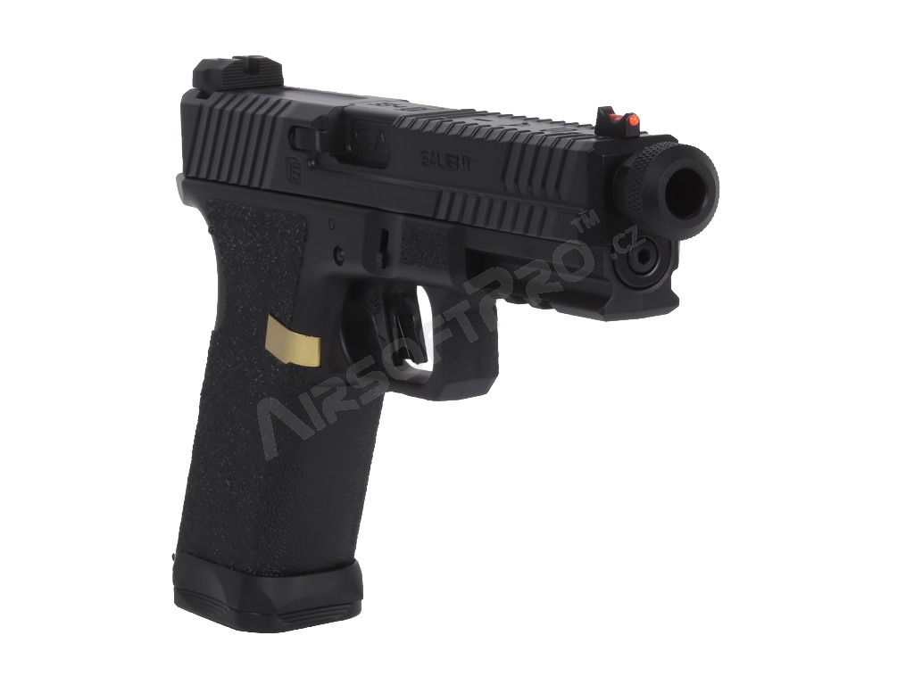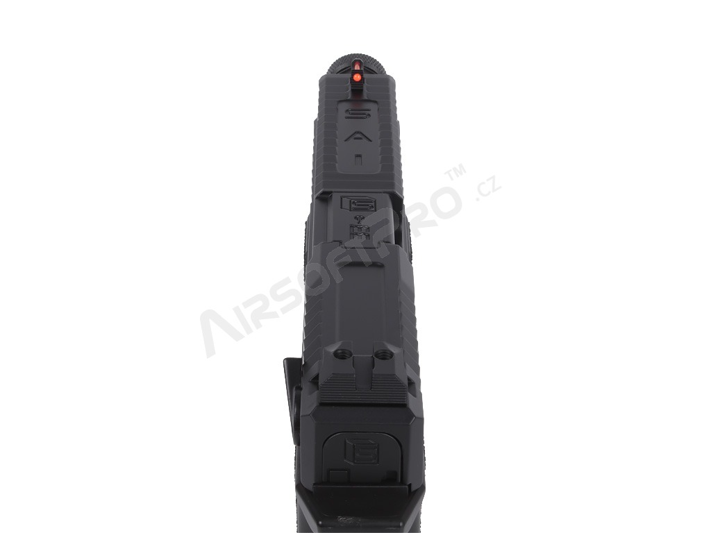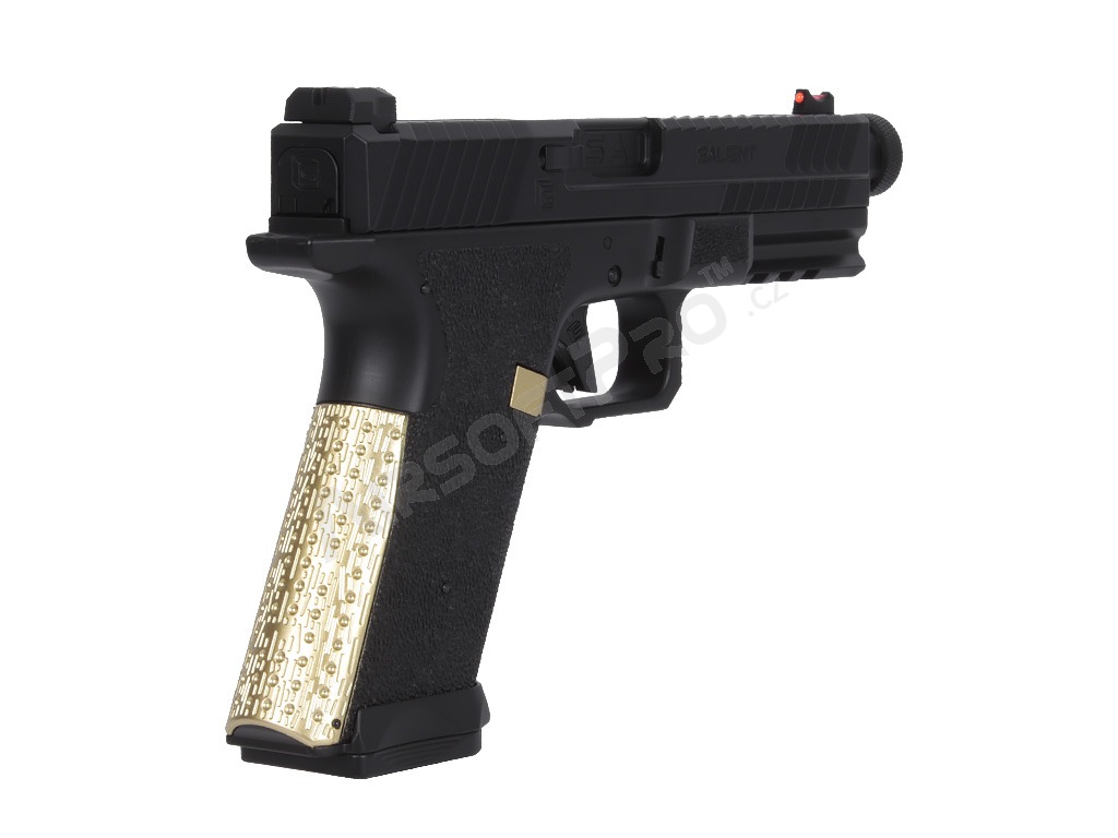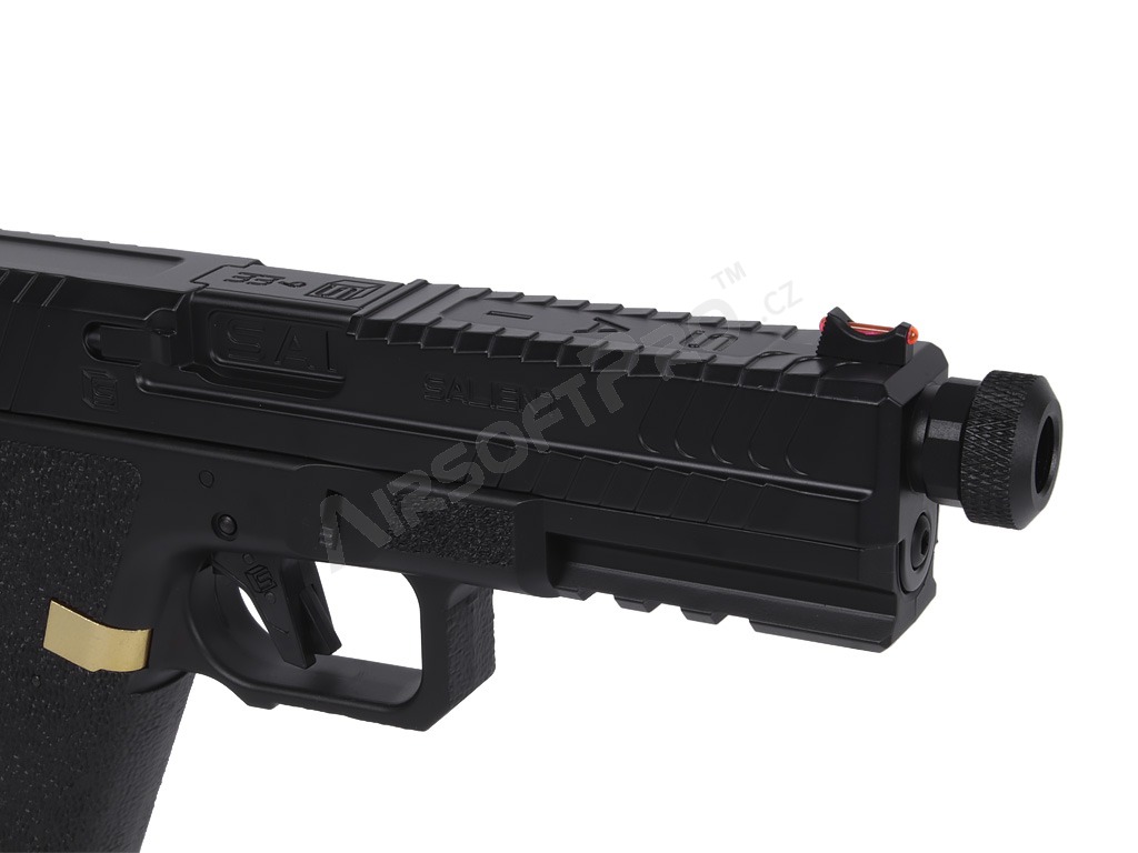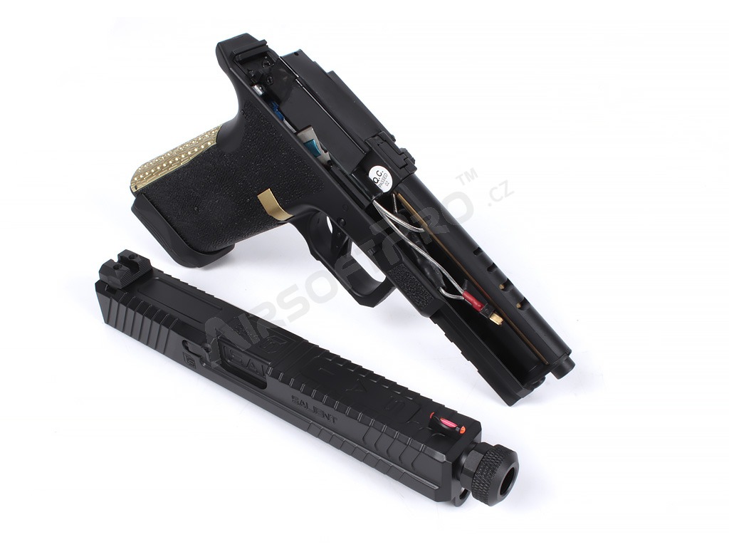 El cuerpo combina partes metálicas y de polímero - armazón de polímero con ergonomía mejorada y textura de agarre agresiva para un agarre seguro. El diseño se complementa con elementos decorativos dorados que acentúan el aspecto "Blue Edition". El arma tiene una culata de plástico y realistas relieves en el armazón y la corredera. Bajo el protector de rosca se encuentra una rosca izquierda de 14 mm. Las miras son de guía luminosa.