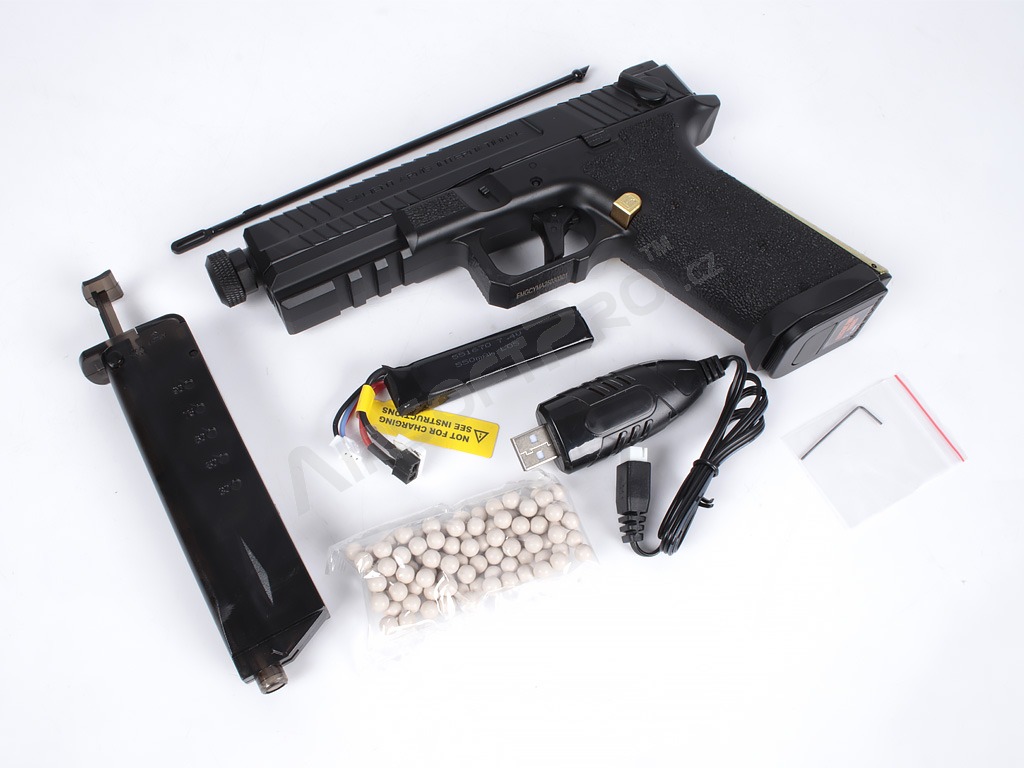 La tensión de batería recomendada es de 7,4 V; son compatibles las baterías Li-Po de 73×15×10 mm conectadas mediante un miniconector T-Dean. La batería se coloca directamente en el cuerpo del arma, debajo de la corredera.