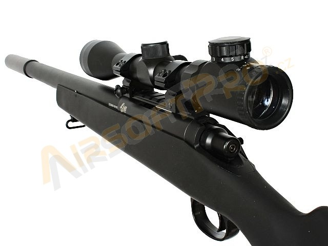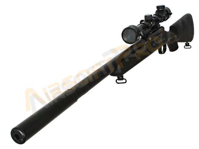 Además del rifle también encontrará un cargador, un supresor, una muestra de balas de 0,20g/200pc, una liberación rápida del cargador, una varilla de limpieza del cañón y, lo más importante, un visor con anillas de montaje. Este último es un M1 bastante superior. ¡Todo metálico con 3-9 aumentos, 40 mm de diámetro de objetivo y su cruz deliberada puede iluminarse en rojo o verde!