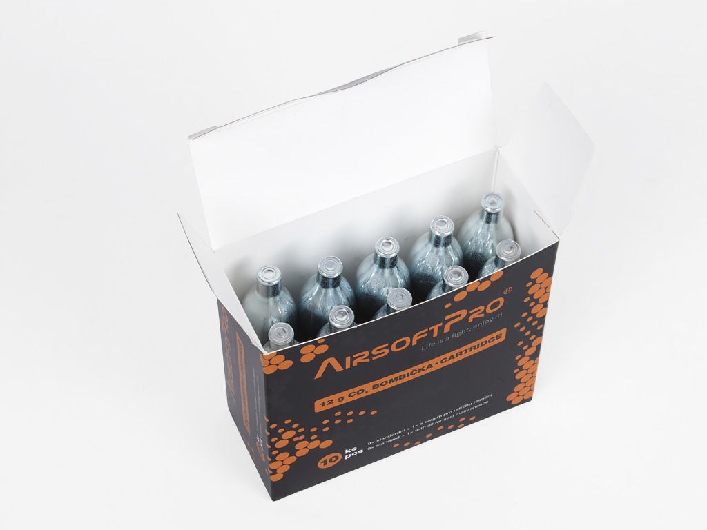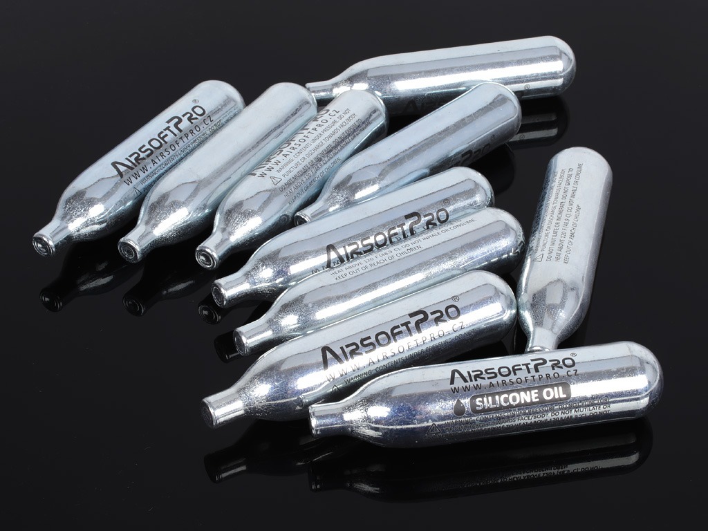 AirsoftPro conjunto de diez bombas de CO2 de 12 gramos. Consta de 9 clásico y 1 cartucho con aceite de silicona.