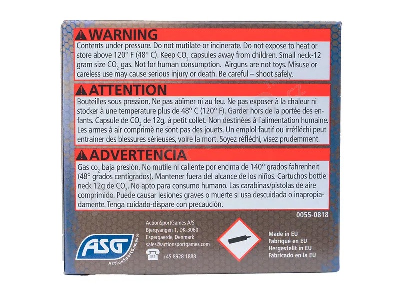 es un líder mundial en el negocio de la fabricación de réplicas de armas de fuego y accesorios - incluyendo pistolas de Airsoft, Airguns, pistolas de CO2 y réplicas de armas de fuego. Están especializados en réplicas de armas y accesorios a escala 1:1 para la diversión, la acción, el deporte, el entretenimiento y la colección. Su surtido se compone principalmente de modelos con licencia y sub-marcas exclusivas de ActionSportGames® A/S. Uno de los objetivos de ASG es convertirse en el proveedor preferido en el negocio de las réplicas de armas de fuego a través de acuerdos de licencia a nivel mundial, marcas de calidad y un servicio de primera calidad - antes, durante y después de la venta. La cooperación con CZ, de la República Checa, es un buen ejemplo de lo exitosa que puede ser una asociación de este tipo, ya que la mayoría de las armas de fuego de producción de CZ están ahora representadas tanto como armas de Airsoft como de Airguns.