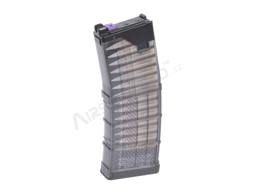 Cargador Lancer Systems L5 Advanced Warfighter (L5AWM) en .300 Blackout. Este cargador está diseñado para el usuario que exige el máximo nivel de realismo: capacidad para 20 cartuchos y laterales transparentes, con una foto de los cartuchos del .300 debajo para obtener la mayor aproximación posible al aspecto del cargador original.