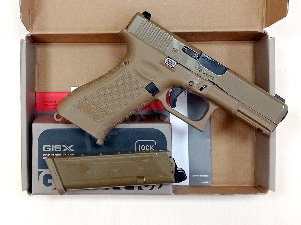 Pistola de airsoft Glock 19X, corredera metálica, retroceso por gas - Coyote - DEVUELTA POR EL CLIENTE [UMAREX]
