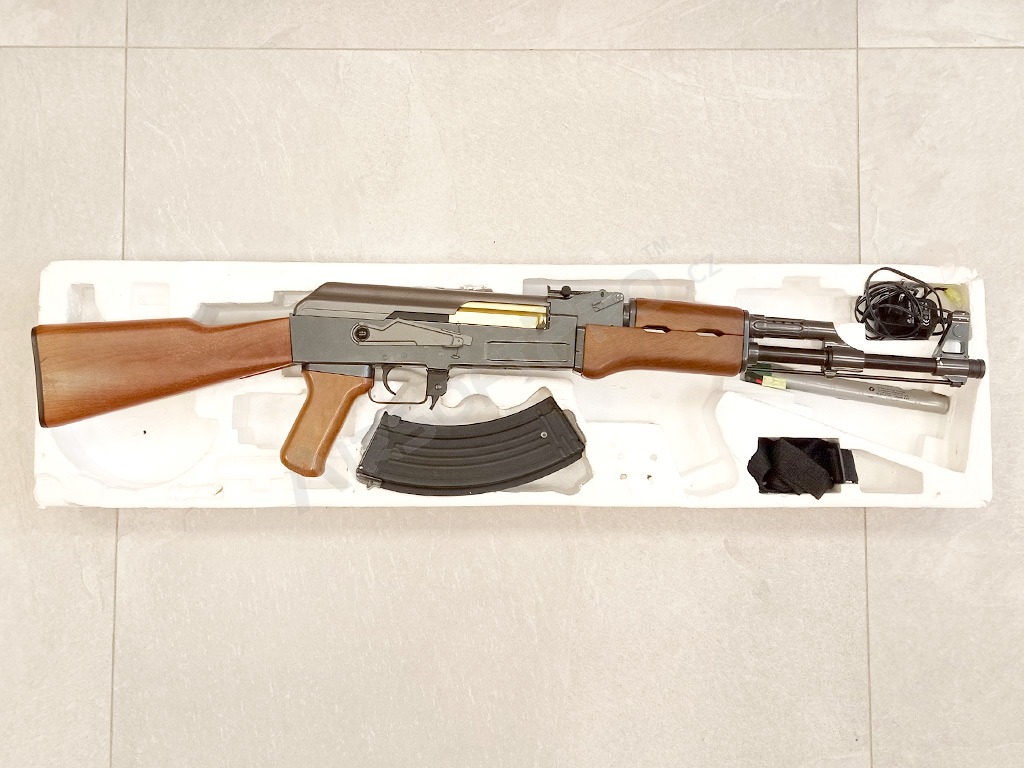 Réplica de airsoft del icónico AK47 en tamaño real 1:1. La imitación de plástico de la culata de madera, guardamanos y antebrazo es bastante creíble y el arma no difiere a primera vista de los modelos más caros. La mayor parte del arma está hecha de plástico y esto permitió reducir significativamente el precio. La ventaja innegable es también el menor peso y por lo tanto el movimiento más fácil del arma. Por lo tanto, está diseñado para los jugadores más jóvenes, principiantes, o simplemente aquellos que quieren un arma eléctrica con todas las funciones al precio más bajo posible.