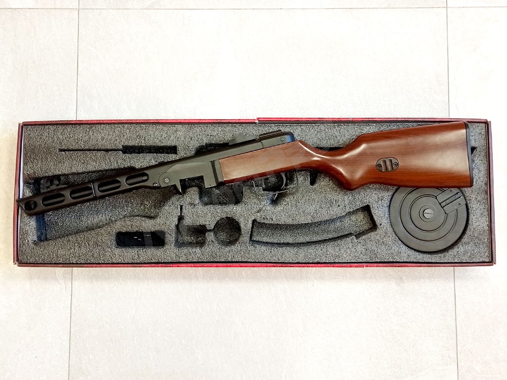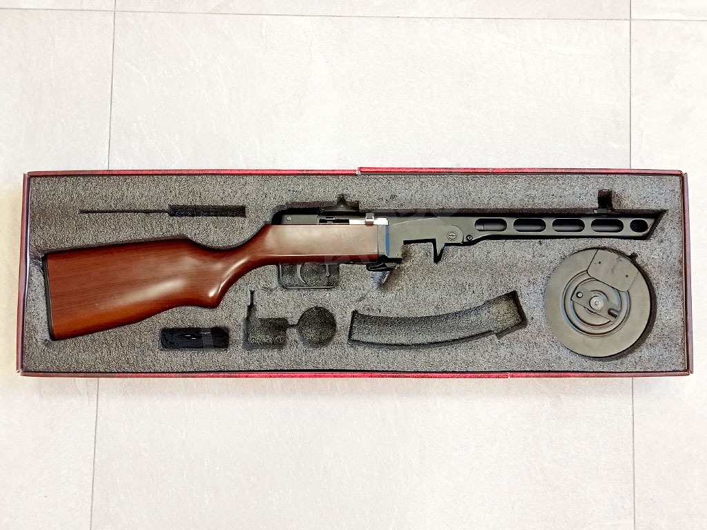 Este clásico entre las armas de la Segunda Guerra Mundial no necesita una larga presentación. El PPSh, o "Spagin" era un arma típica del Ejército Rojo. Esta réplica está hecha según su modelo real. El arma está fabricada en acero y plástico imitación madera. También tiene un blowback eléctrico que mueve no sólo la palanca de amartillado de la culata, sino también la ventana de liberación de la culata al disparar.