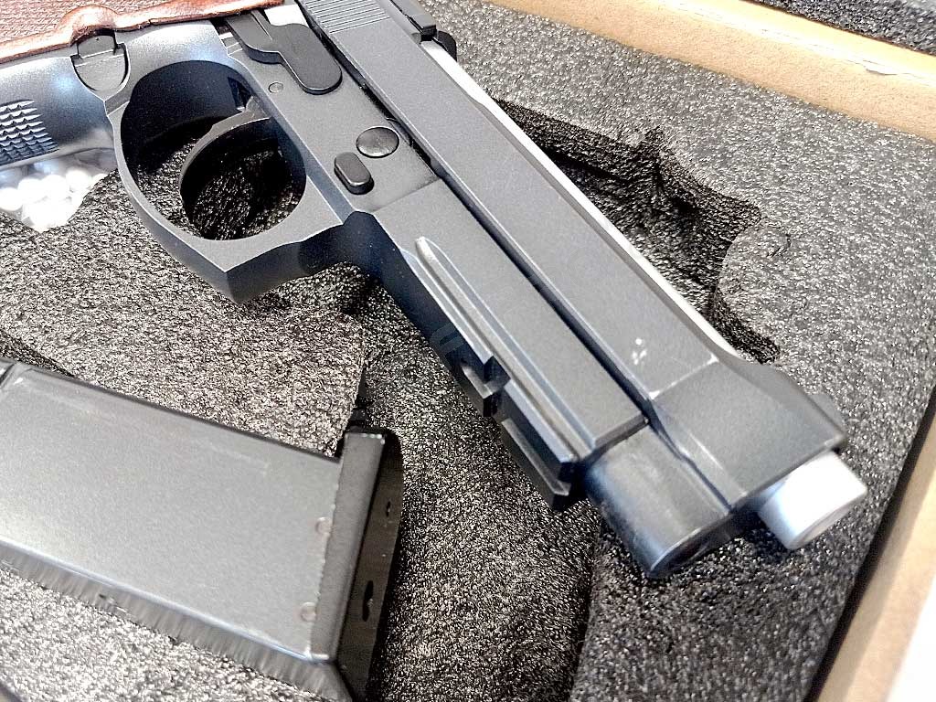 La pistola tiene armazón y corredera de metal con sistema Blowback, cañones de madera texturizada. Las miras son fijas, con un punto blanco en las miras para apuntar mejor. El aspecto general de la pistola coincide con el modelo M9A1 real, incluyendo un seguro ambidiestro funcional y desmontaje. Hay un raíl en la parte inferior del armazón para montar una luz o un láser.