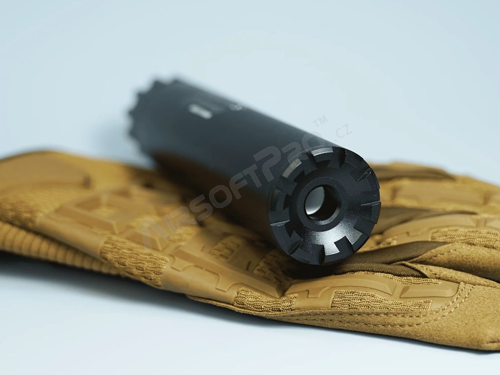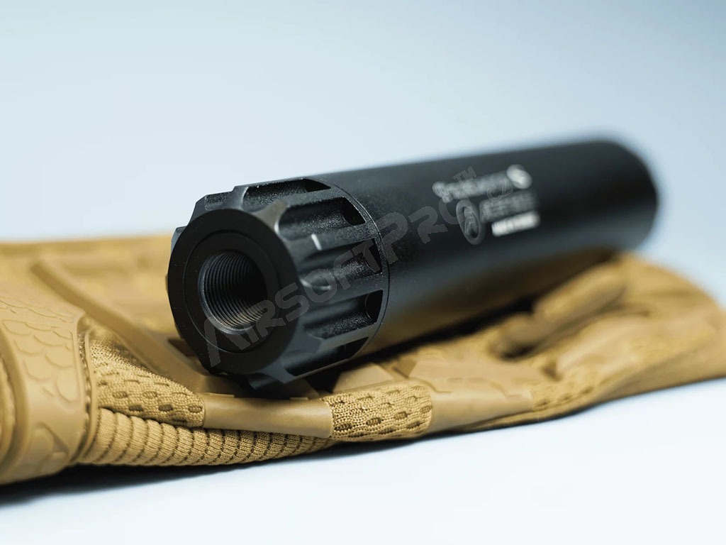 La unidad de iluminación está alojada en una carcasa de aluminio con acabado anodizado mate. Funciona con una batería Li-Ion 10440 de 3,7 V (incluida). La unidad AT2000R se inserta en el supresor y queda muy bien centrada y asegurada por un muelle contra el desplazamiento - sin juego que pudiera causar problemas al disparar. La rosca estándar M14 (-) lo hace utilizable en la gran mayoría de armas de airsoft con supresor de llama desmontable.