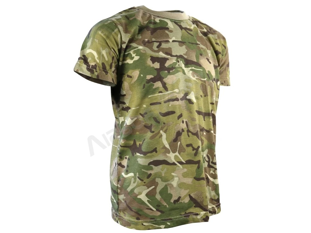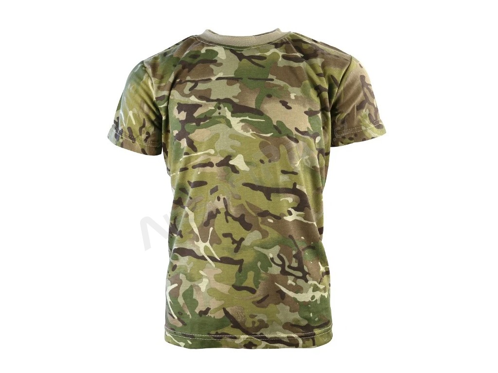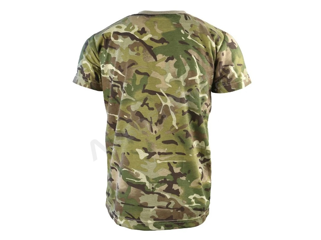 La camiseta infantil con estampado de camuflaje tiene cuello redondo, manga corta y un estampado de camuflaje integral. La camiseta está hecha de algodón 100% con un peso de 170 g/m2, lo que la convierte en una camiseta ideal para el uso diario o el juego de los pequeños soldados.
