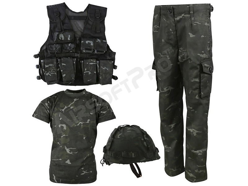 La elección perfecta para los pequeños exploradores El conjunto Kids No.1 incluye ropa con el patrón de camuflaje BTP Black (British Terrain Pattern Black - similar al patrón Multicam Black), ideal para juegos al aire libre, acampadas o airsoft.