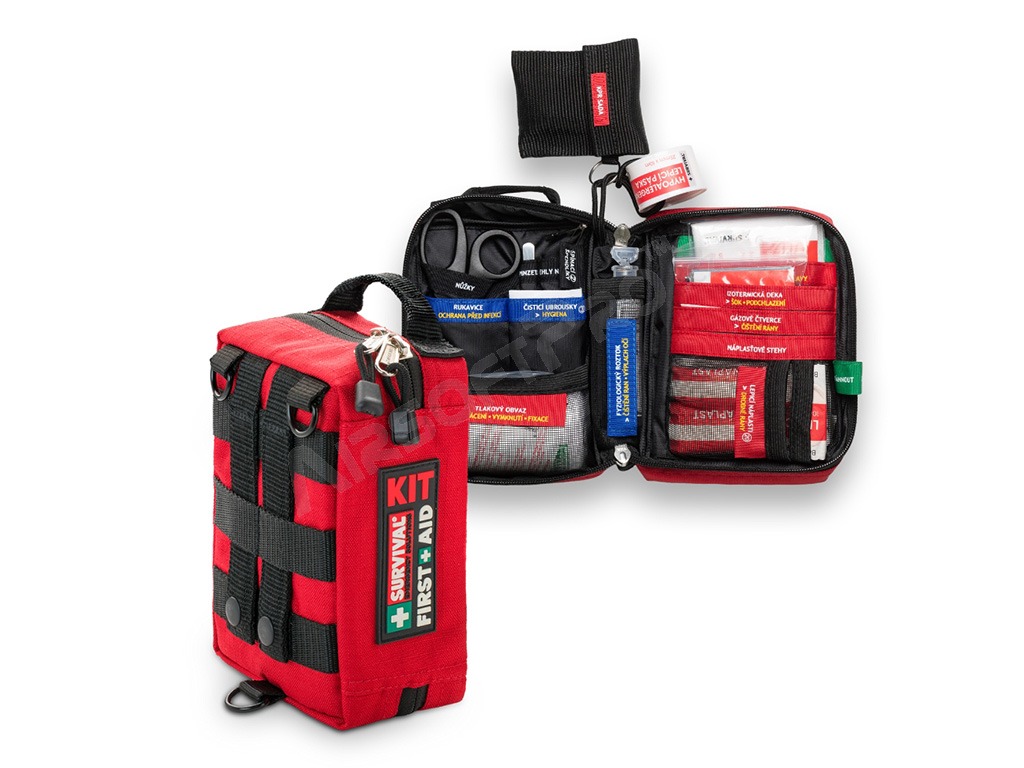 SURVIVAL First Aid KIT - Small es el botiquín más compacto de la gama SURVIVAL, diseñado para llevarlo a diario y utilizarlo rápidamente sobre la marcha. A pesar de su reducido tamaño, sorprende por su estudiado sistema: el material está dividido en secciones codificadas por colores según el tipo de lesión, y cada bolsillo tiene una etiqueta claramente legible que permite saber inmediatamente dónde hay que buscar.