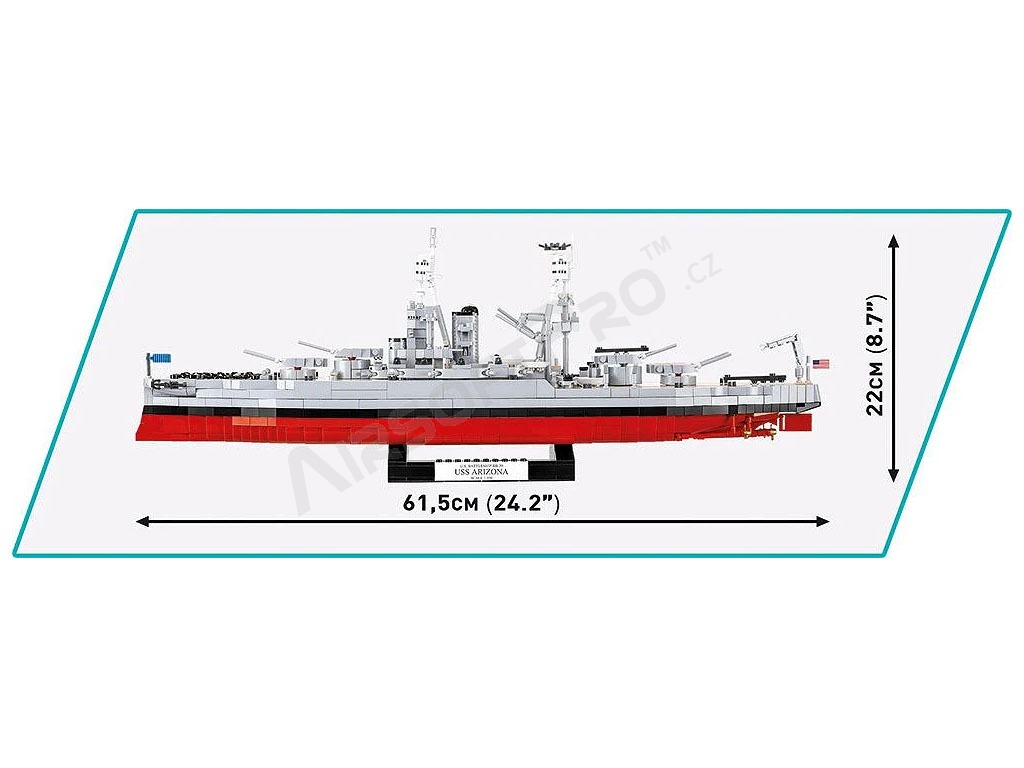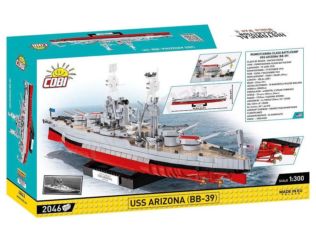 El USS Arizona es un acorazado botado durante la Primera Guerra Mundial. Durante su servicio, el buque fue modernizado. El Arizona estuvo presente en Pearl Harbor durante el ataque japonés del 7 de diciembre de 1941. Durante el ataque, se produjo una explosión catastrófica a bordo del buque. La mayor parte de la tripulación pereció y el buque se hundió, convirtiéndose en un símbolo del ataque japonés. Los restos del acorazado nunca se recuperaron. Los elementos de la superestructura que sobresalían por encima del agua fueron retirados, quedando sólo la barbeta de la tercera torreta del cañón principal por encima de la línea de flotación. En 1962 se inauguró el mausoleo del USS Arizona sobre los restos del naufragio. El famoso buque fue diseñado a escala 1:300 y mide 24 pulgadas de largo. ¡Más de 2.046 dados proporcionarán horas de emocionante construcción! Unas instrucciones claras e intuitivas le guiarán por el proceso con facilidad. Este set coleccionable incluye un soporte para ladrillos en el que podrás colocar una placa con el nombre del famoso barco. Utilizando los últimos componentes disponibles y técnicas de construcción avanzadas, el modelo refleja fielmente las proporciones del histórico buque y conserva todas sus características esenciales, incluida la forma original y muy distintiva del casco y la superestructura. El modelo cuenta con varias piezas móviles, como: hélices, timones, torretas giratorias y, lo que es más importante, cañones que se pueden subir y bajar.