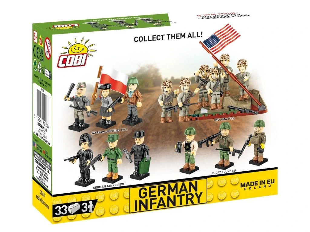 El set de figuras incluye dos figuras realistas de infantería alemana y una figura de cazador de montaña de la Segunda Guerra Mundial.