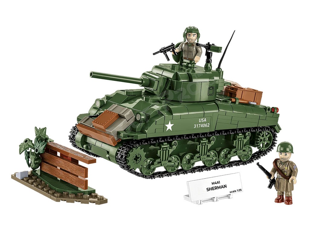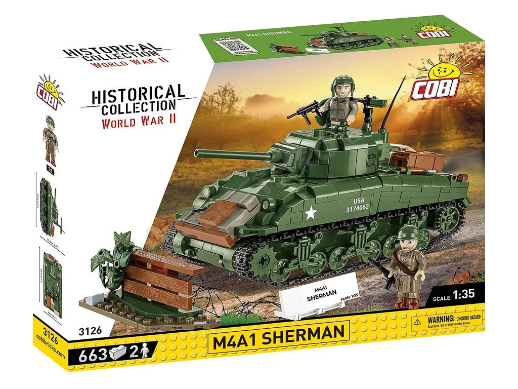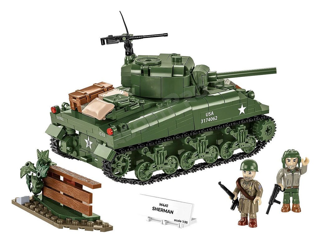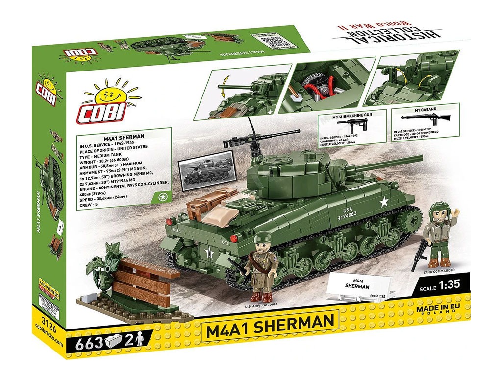 El M4 Sherman fue el tanque medio americano básico producido durante la Segunda Guerra Mundial. Este kit de COBI está cuidadosamente diseñado a escala 1:35 y consta de 663 ladrillos. El tanque tiene orugas que funcionan, una torreta giratoria, un cañón móvil, una escotilla que se abre y una cubierta de servicio con un motor simulado en su interior. El set incluye dos figuras: un tanquista estadounidense con casco y subfusil M3 "Grease Gun" y un soldado de infantería vestido con abrigo y fusil M1 Garand. Se completa con elementos ambientales: un tramo de valla con un seto de arbustos, que confiere al decorado la atmósfera de un campo de batalla. Las impresiones de los modelos son de muy alta calidad, realistas y capturan con precisión las marcas de los tanques y los detalles de los uniformes.