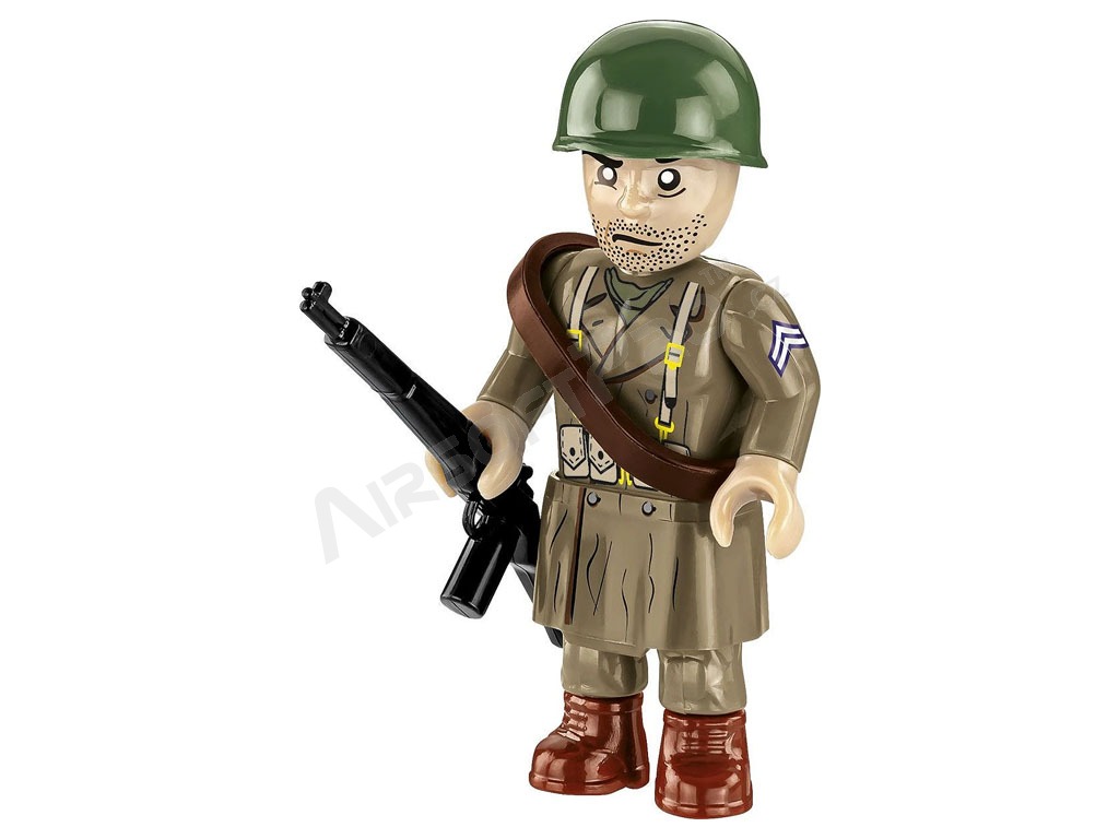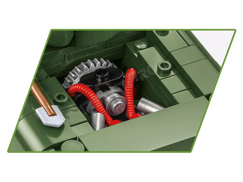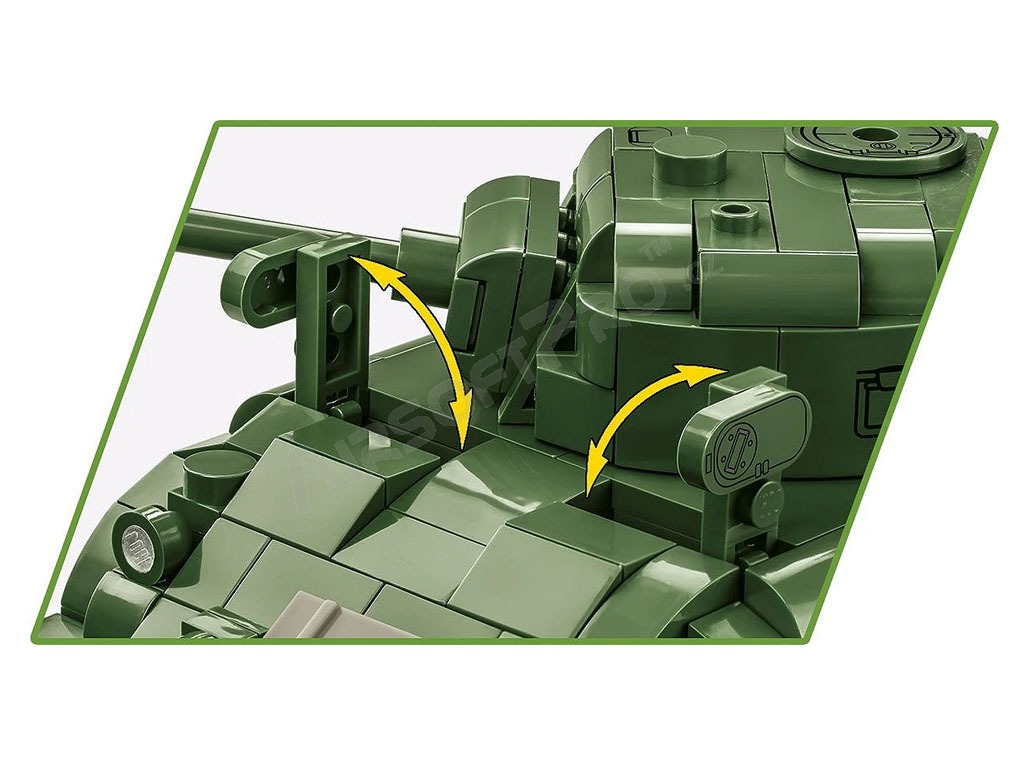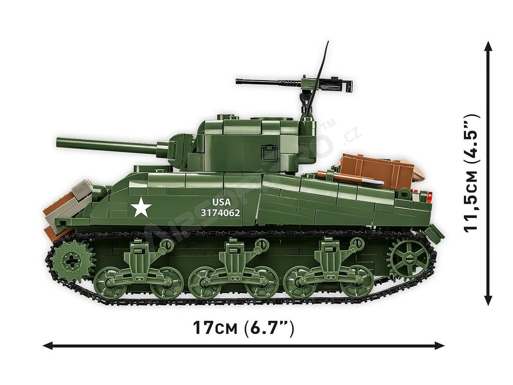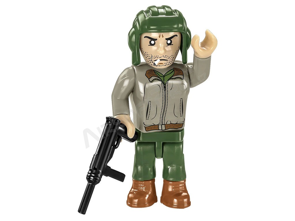 El M4 Sherman fue el tanque medio americano básico producido durante la Segunda Guerra Mundial. Este kit de COBI está cuidadosamente diseñado a escala 1:35 y consta de 663 ladrillos. El tanque tiene orugas que funcionan, una torreta giratoria, un cañón móvil, una escotilla que se abre y una cubierta de servicio con un motor simulado en su interior. El set incluye dos figuras: un tanquista estadounidense con casco y subfusil M3 "Grease Gun" y un soldado de infantería vestido con abrigo y fusil M1 Garand. Se completa con elementos ambientales: un tramo de valla con un seto de arbustos, que confiere al decorado la atmósfera de un campo de batalla. Las impresiones de los modelos son de muy alta calidad, realistas y capturan con precisión las marcas de los tanques y los detalles de los uniformes.