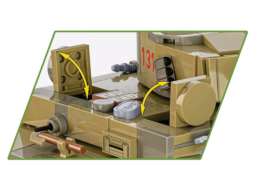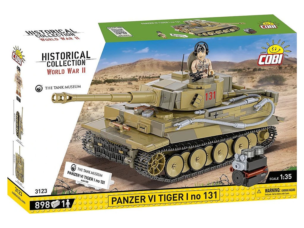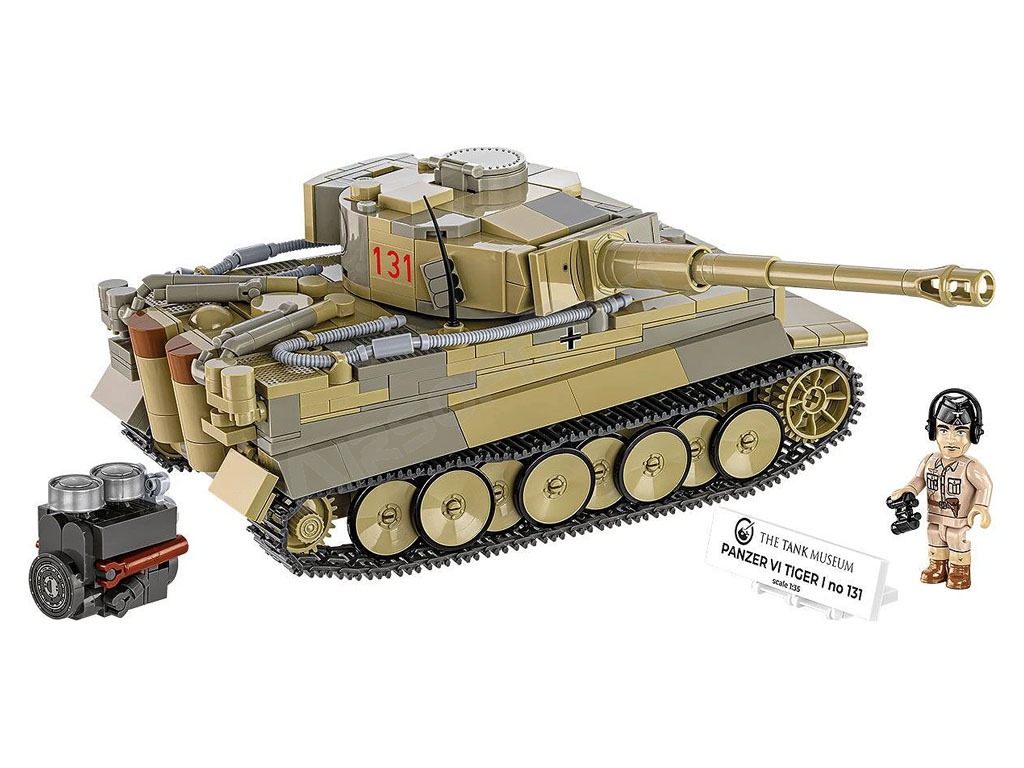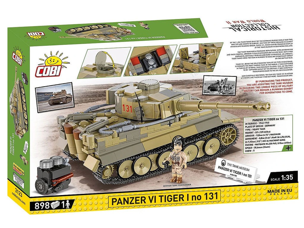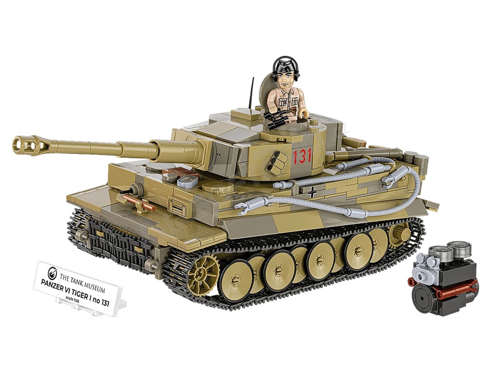 Nuestro Tiger 131 ha sido reproducido con todo lujo de detalles en la popular escala 1:35 Cabe destacar que es la primera vez que COBI lanza el legendario Tiger 131 en este tamaño El modelo cuenta con elementos móviles como la torreta y el cañón del arma, así como ruedas giratorias y orugas. El elaborado set consta de 898 elementos y refleja fielmente las formas originales de su inspiración histórica. Nuestro poderoso tanque está cubierto de estampados de alta calidad que no se deshilachan. Destacan especialmente los colores, que se acercan a los originales y hacen que la maqueta luzca deslumbrante El set incluye una maqueta del motor Maybach, que puede exponerse junto a la maqueta o colocarse en el tanque bajo la cubierta de servicio. La maqueta tiene ruedas móviles y orugas compuestas de muchos eslabones. Durante el juego puedes conducir el tanque y ver cómo funcionan las orugas Las escotillas se abren y debajo hay espacio para las figuras COBI estándar. La figura representa al comandante del tanque con uniforme tropical. Una placa blanca con el nombre del tanque y el logotipo del Museo de Tanques impresos completa el conjunto