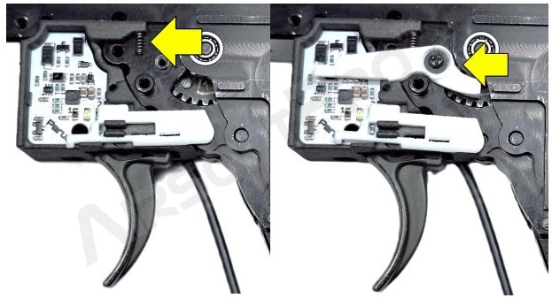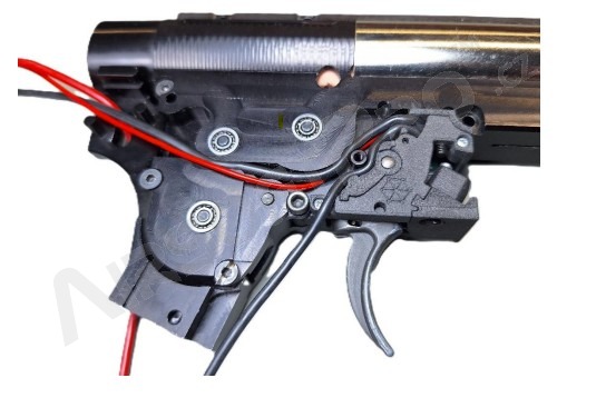 - Freno activo - El freno activo detiene el motor después de cada disparo, evitando que el muelle se comprima o, en el caso de réplicas con una cadencia de disparo elevada, que se dispare en exceso (problema del doble disparo).