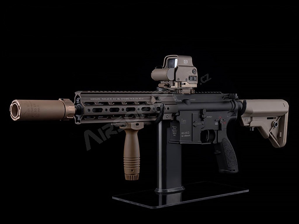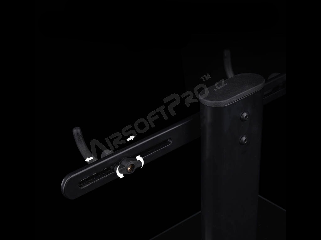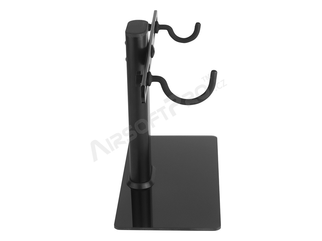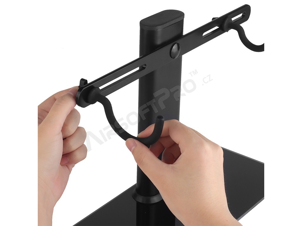 El soporte utiliza dos ganchos de goma para sujetar el arma. Se incluyen 5 formas de gancho diferentes, lo que hace que el soporte sea adecuado para la gran mayoría de armas largas. El brazo del soporte se puede girar para conseguir posiciones visualmente efectivas para el arma expuesta. Además, la base de cristal acentúa con elegancia el aspecto del rifle expuesto.