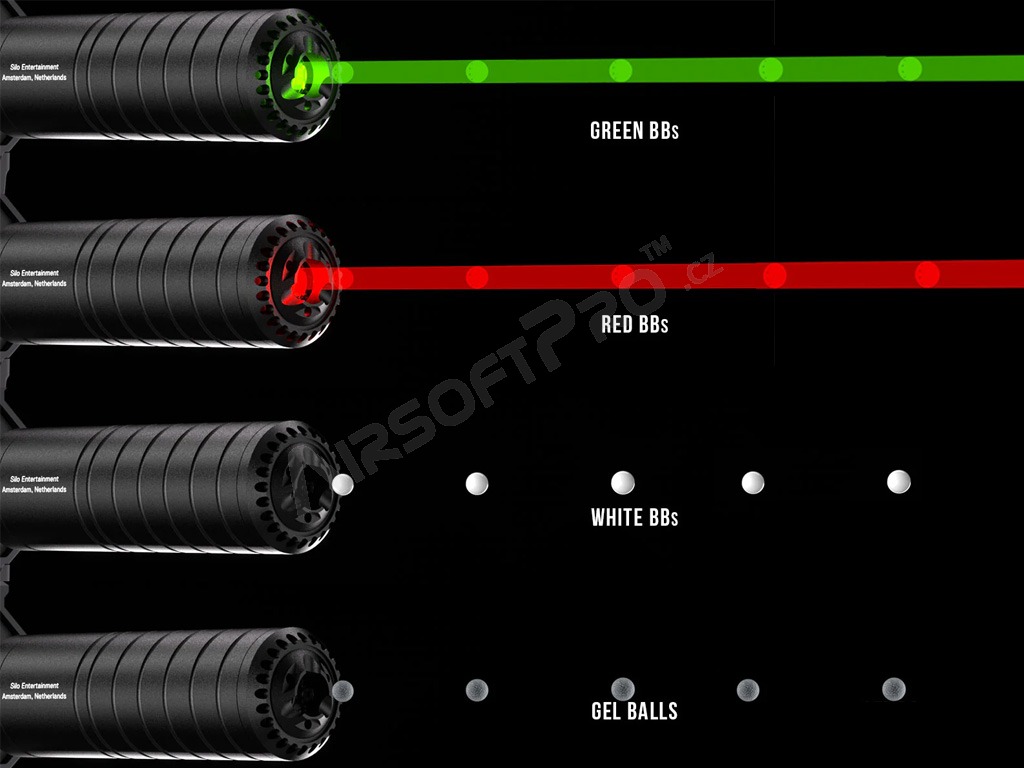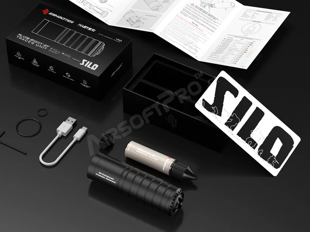 8 modos de luz y humo - incluyendo estroboscópico, trazador, humo y combinaciones de estos Eshooter App - controla la intensidad del humo, realiza un seguimiento de las estadísticas, utiliza el cronógrafo y más Respuesta rápida - soporta más de 50 disparos por segundo Construcción modular y aluminio CNC - larga vida y protección en condiciones extremas Resistencia - hasta 3 meses en espera, aprox. 6 horas de funcionamiento con una sola carga Se recomienda utilizar sólo aceites genuinos Eshooter para un funcionamiento seguro. Los mejores resultados se obtienen con perlas de iluminación verdes.